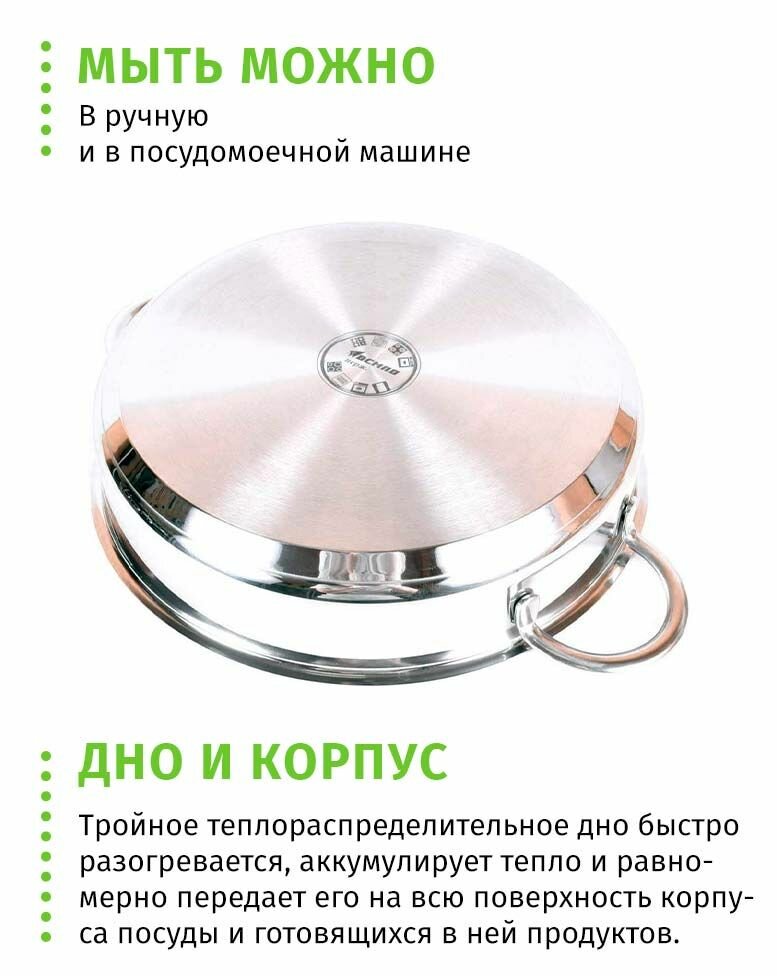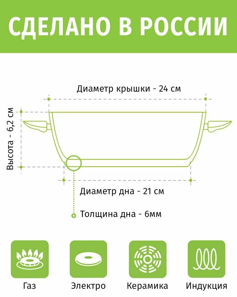 | Плюсы: | плотный металл, толстое дно, не пригорает еда, вместительная сковородка |