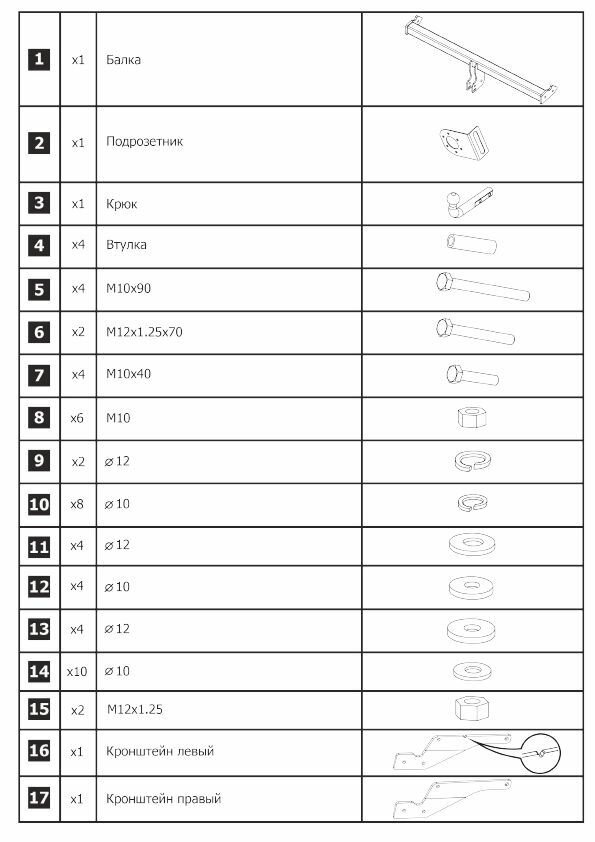 | Подробная комплектация | Крюк с шаром -1 шт; Балка поперечная -1 шт; Подрозетник-1 шт; Кронштейн левый-1 шт; Кронштейн правый -1 шт; Проставка -2 шт; Болты, Гравера, Шайбы, Гайки; Паспорт- 1 шт; Сертификат -1 шт |