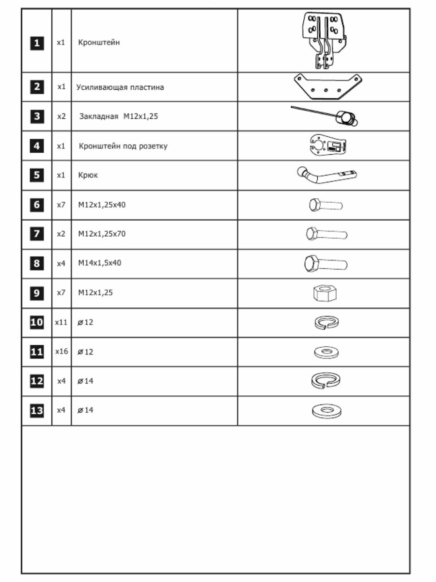 | Подробная комплектация | Комплектация фаркопа на avto Танк 500, Хавал Н5, Хавал Н9: Крюк с шаром -1 шт; Кронштейн -1 шт; Усиливающая пластина - 1 шт; Закладная М12х1,25 - 2 шт; Кронштейн под розетку - 1 шт; Аксессуары: Болты, Гравера, Шайбы, Гайки; Паспорт- 1 шт; Сертификат -1 шт |