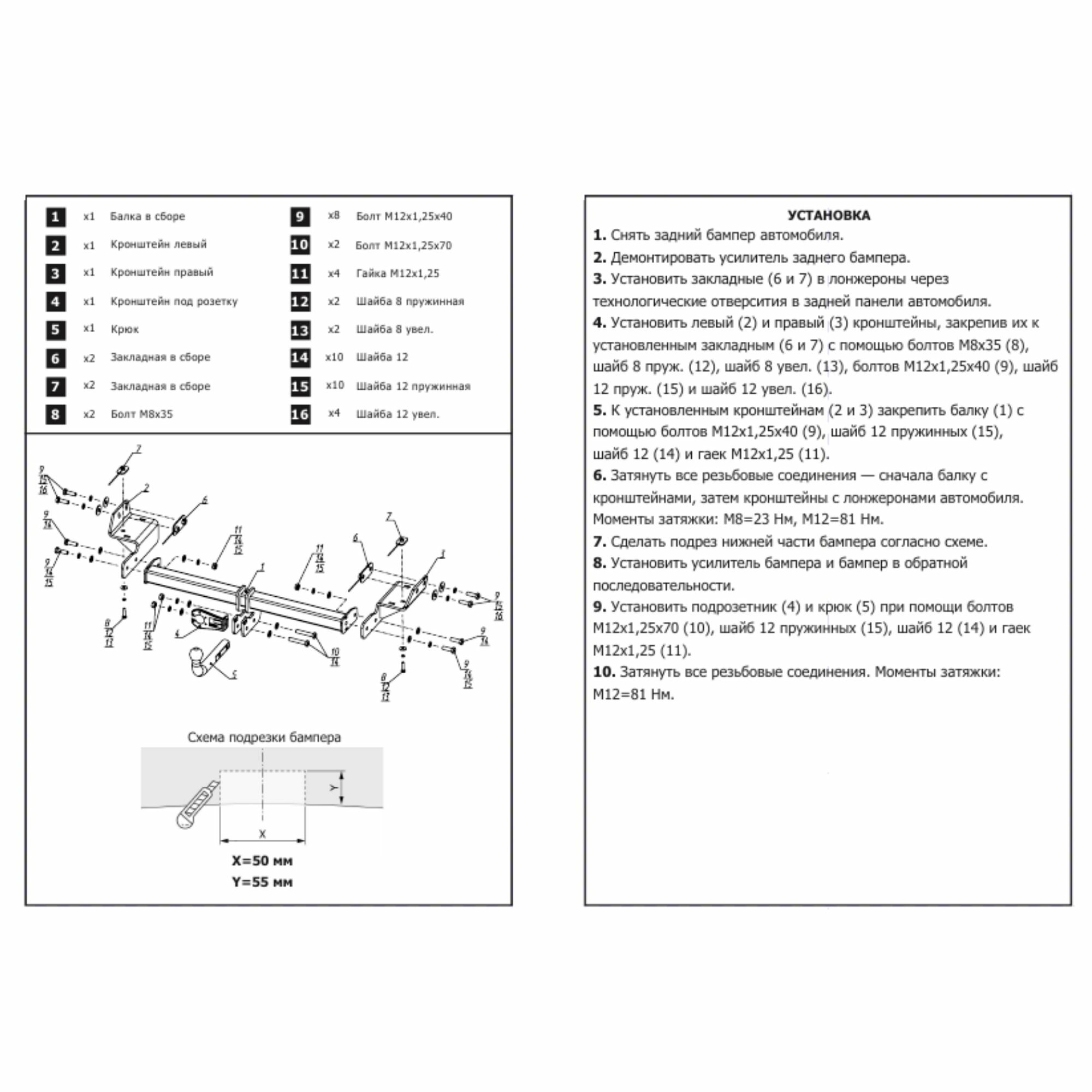 | Подробная комплектация | Крюк с шаром -1 шт; Балка поперечная-1 шт; Кронштейн левый - 1 шт; Кронштейн правый - 1 шт; Закладные - 4 шт; Подрозетник-1 шт; Аксессуары: Болты , Гравера, Шайбы, Гайки; Паспорт- 1 шт; Сертификат -1 шт; Инструкция -1 шт |