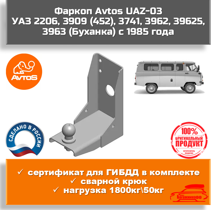 Фаркоп Avtos UAZ-03 дляУАЗ 2206, 3909 (452), 3741, 3962, 39625, 3963 (Буханка) с 1985 года интересное: