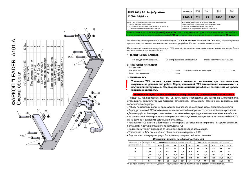 Фаркоп с электрикой для Audi 100, A6 седан (12/1990 - 03/1997) Лидер-Плюс A101-A интересное: