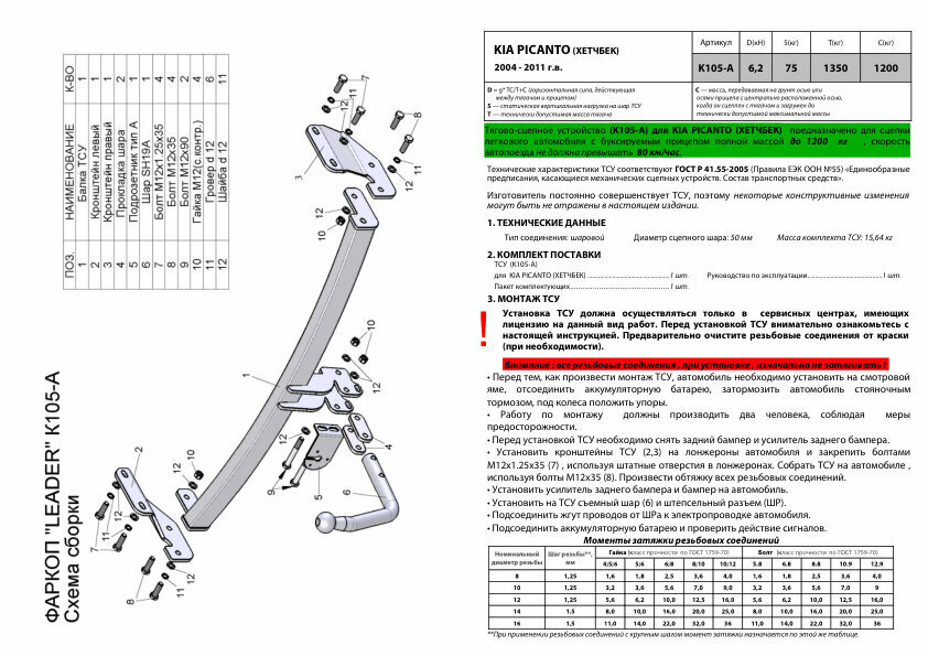 Фаркоп для Kia Picanto (BA) хэтчбек (2004-2011) Лидер-Плюс K105-A интересное: