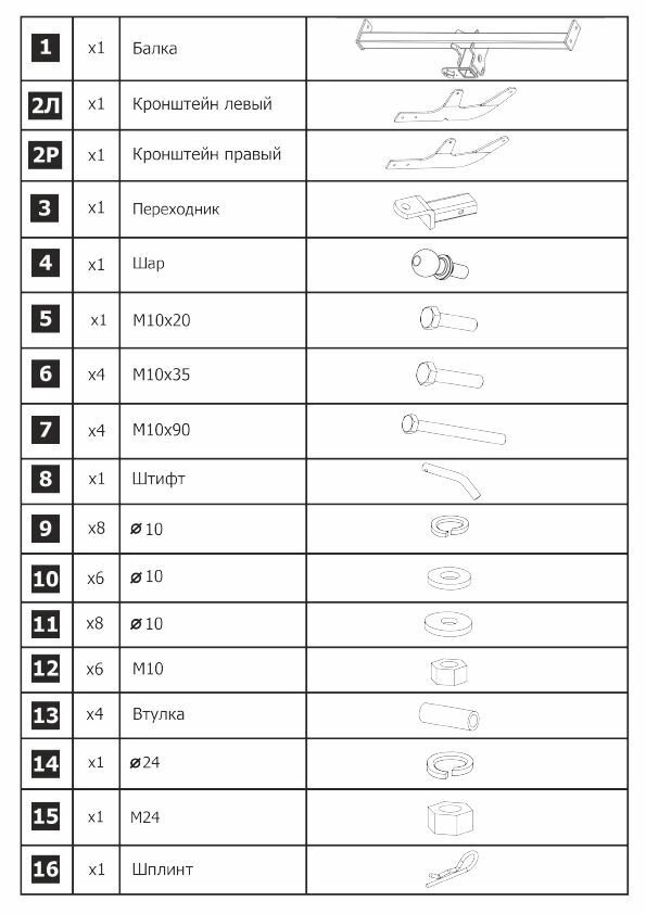 | Подробная комплектация | Крюк с шаром -1 шт; Балка поперечная -1 шт; Подрозетник-1 шт; Кронштейн левый-1 шт; Кронштейн правый -1 шт; Проставка -2 шт; Комплект крепежа; Паспорт- 1 шт; Сертификат -1 шт |