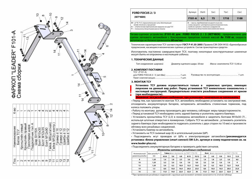 Фаркоп с электрикой для Ford Focus II хетчбек (2004-2011), Ford Focus III хетбчек (2011-2018) Лидер-Плюс F101-A интересное: