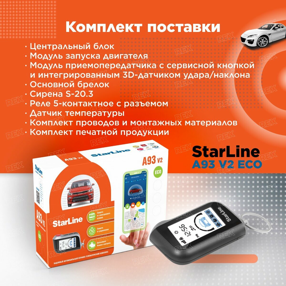 StarLine A93 V2 автосигнализация (автозапуск, брелок ЖК и дополнительный, сирена, без кан-модуля)