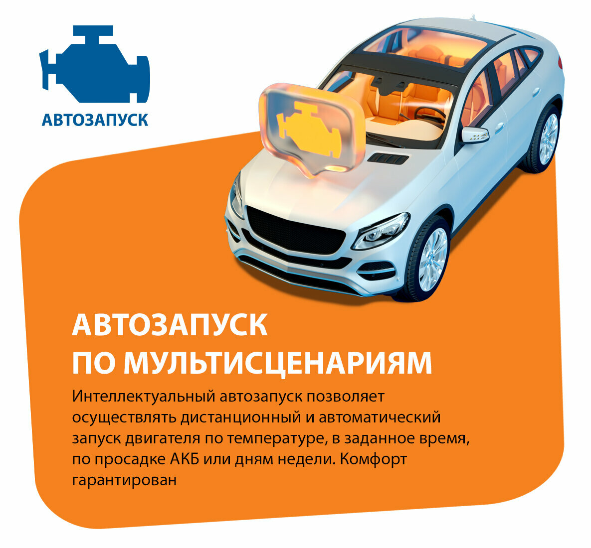 | Автозапуск двигателя | по дням недели / по заданному времени / по температуре / при низком заряде АКБ / через заданные интервалы |