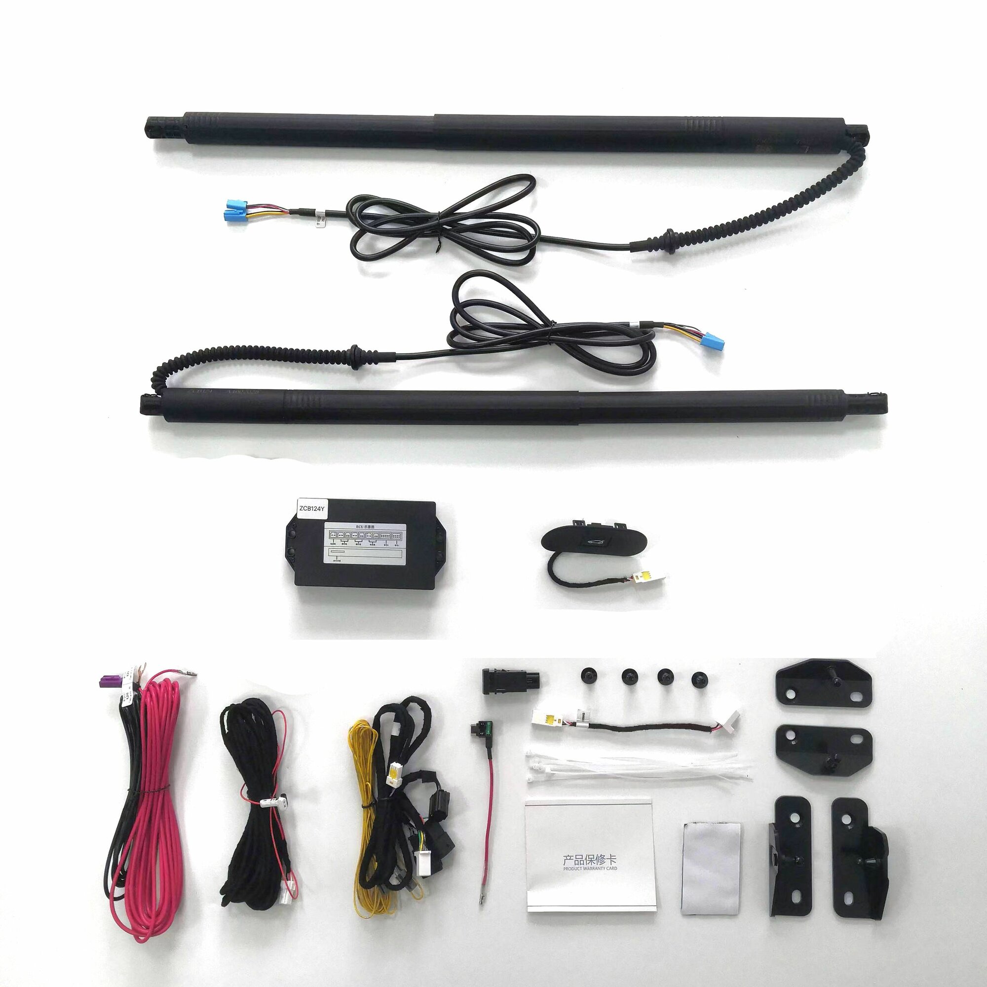 | Состав набора | "1. Электропривод крышки багажника - 2 шт. 2. Электронный блок управления - 1 шт. 3. Кнопка на дверь багажника - 1 шт. 4. Кнопка салона для управления открытием/закрытием багажника - 1 шт. 5. Комплект проводов для подключения привода. 6. Датчик ноги. 7. Инструкция по установке. Y066 |