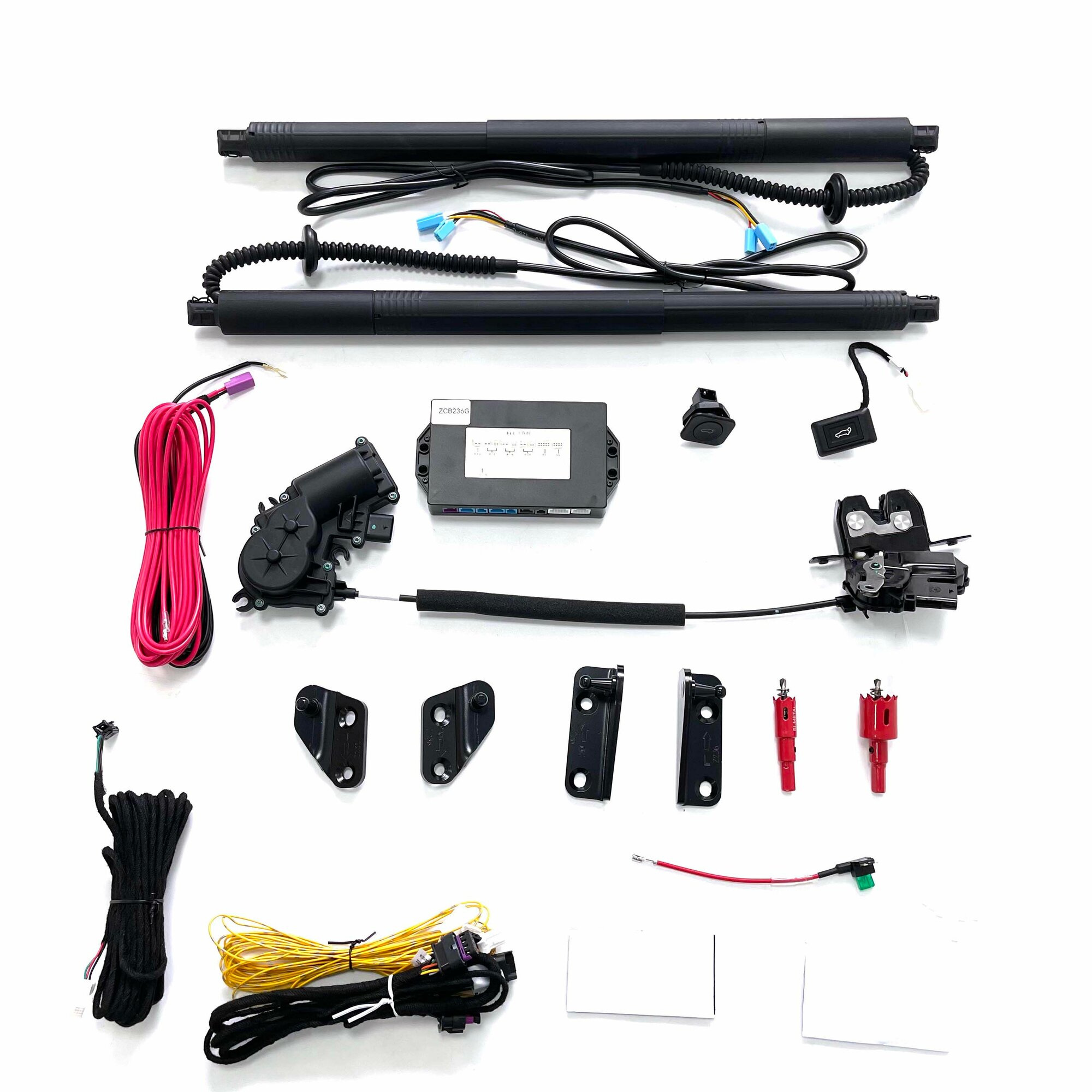 | Состав набора | "1. Электропривод крышки багажника - 2 шт. 2. Электронный блок управления - 1 шт. 3. Кнопка на дверь багажника - 1 шт. 4. Кнопка салона для управления открытием/закрытием багажника - 1 шт. 5. Замок двери багажника - 1 шт. 6. Комплект проводов для подключения привода. 7. Датчик ноги. 8. Инструкция по установке. |