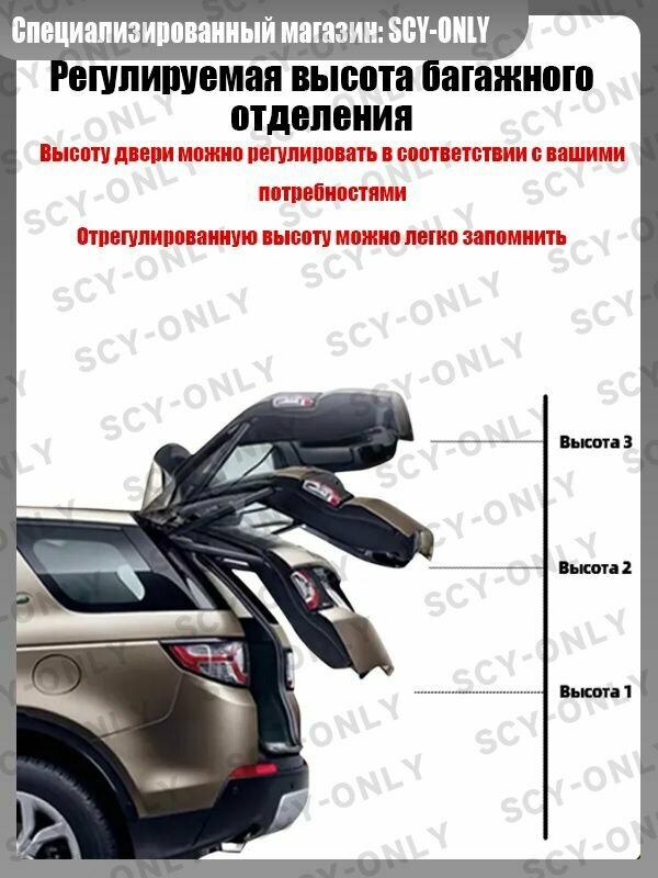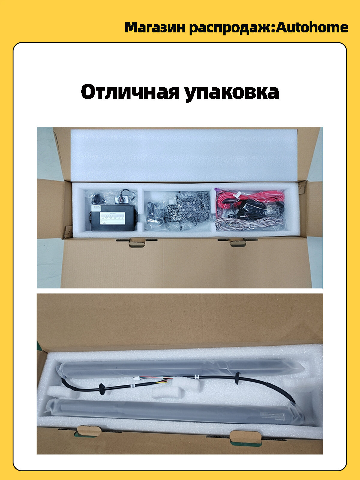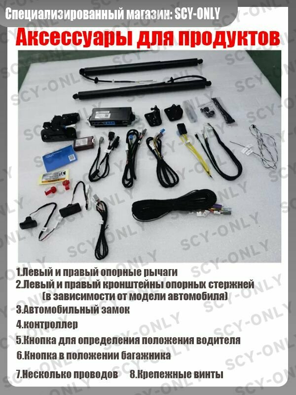 | Состав набора | 1. Электропривода крышки багажника. 2. Электронный блок управления. 3. Кнопка управления закрытием крышки багажника. 4. Кнопка салона для управления открытием/закрытием багажника. 5. Комплект проводов для подключения электропривода. 6. Дотяжка 7. Инструкция по установке |