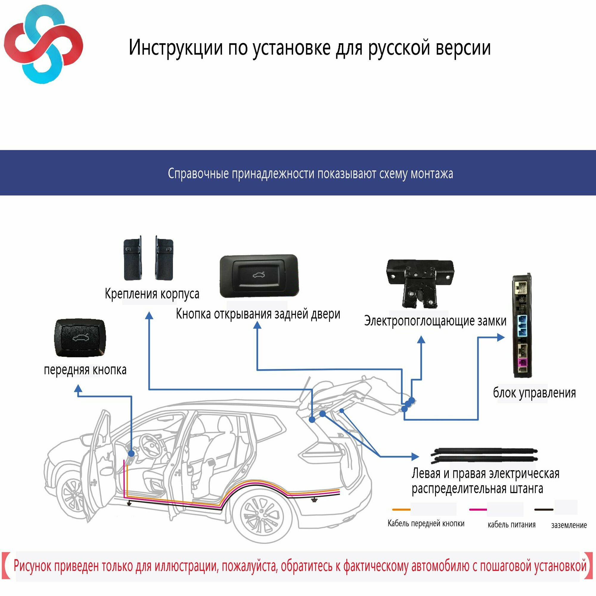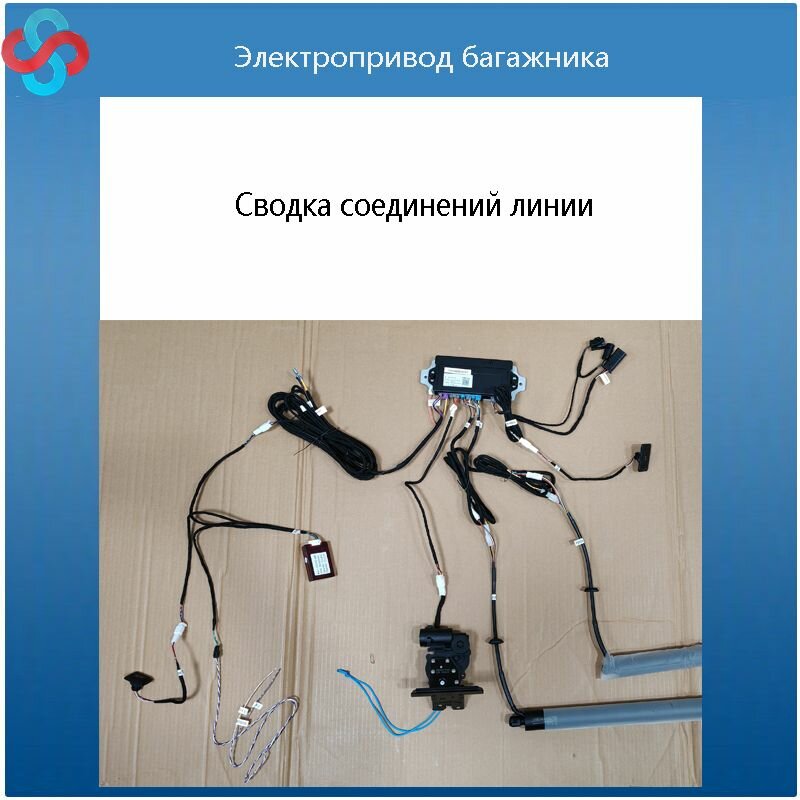 | Состав набора | 1. Электропривода крышки багажника. 2. Электронный блок управления. 3. Кнопка управления закрытием крышки багажника. 4. Кнопка салона для управления открытием/закрытием багажника. 5. Комплект проводов для подключения электропривода. 6.Датчик ноги Foot Sensor для электропривода 7. Дотяжка 8. Инструкция по установке Y561 X162 O315 |