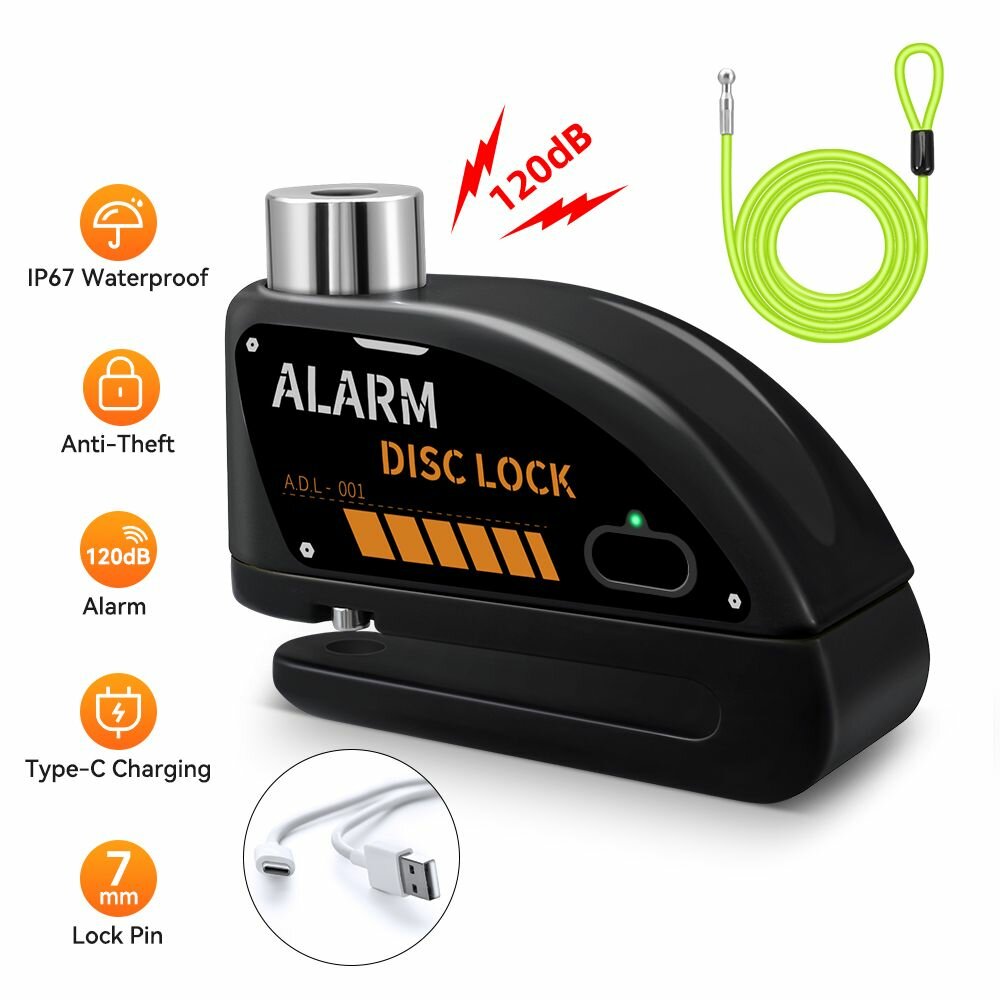Мотоциклетная сигнализация с дисковым тормозным замком, черный + противоугонный кабель флуоресцентного зеленого цвета