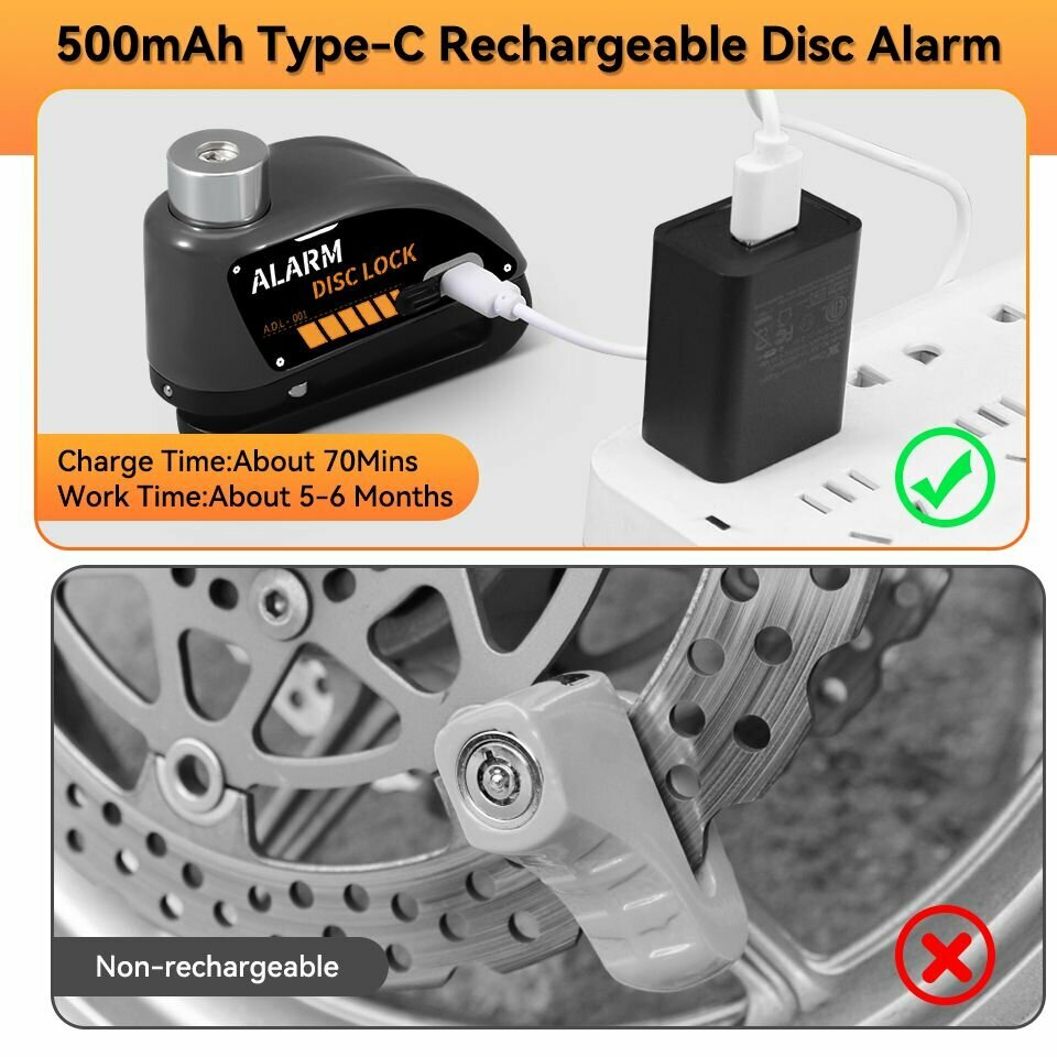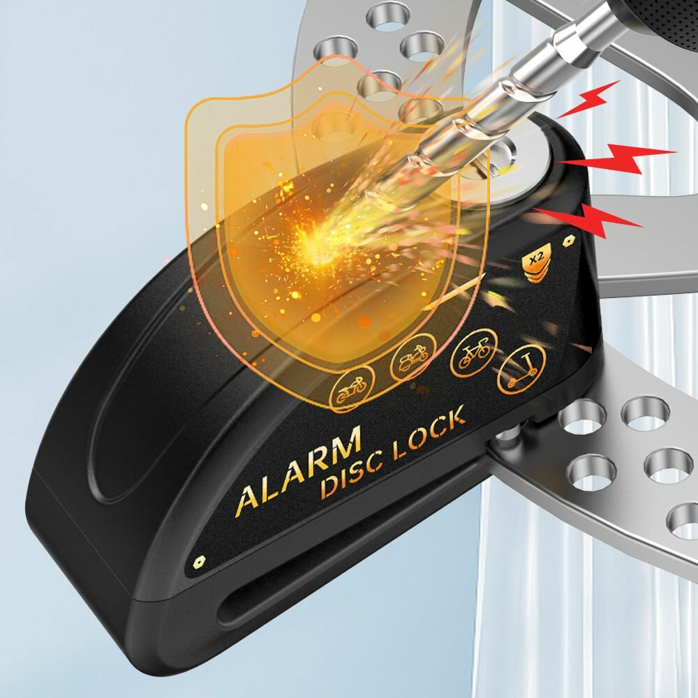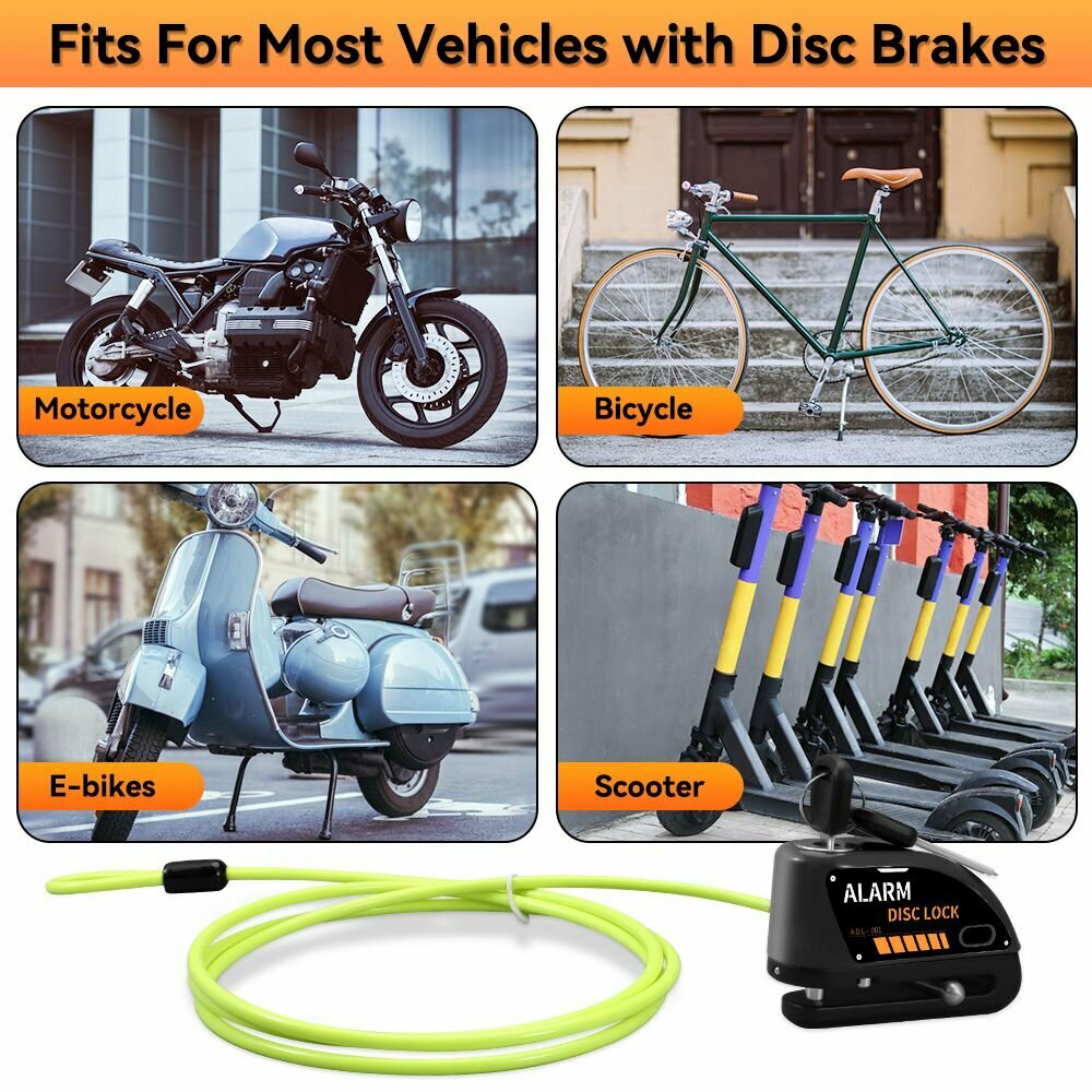 Мотоцикл сигнализация диск тормоза замок, желтый (с черной наклейкой) + флуоресцентный зеленый противоугонный трос интересное: