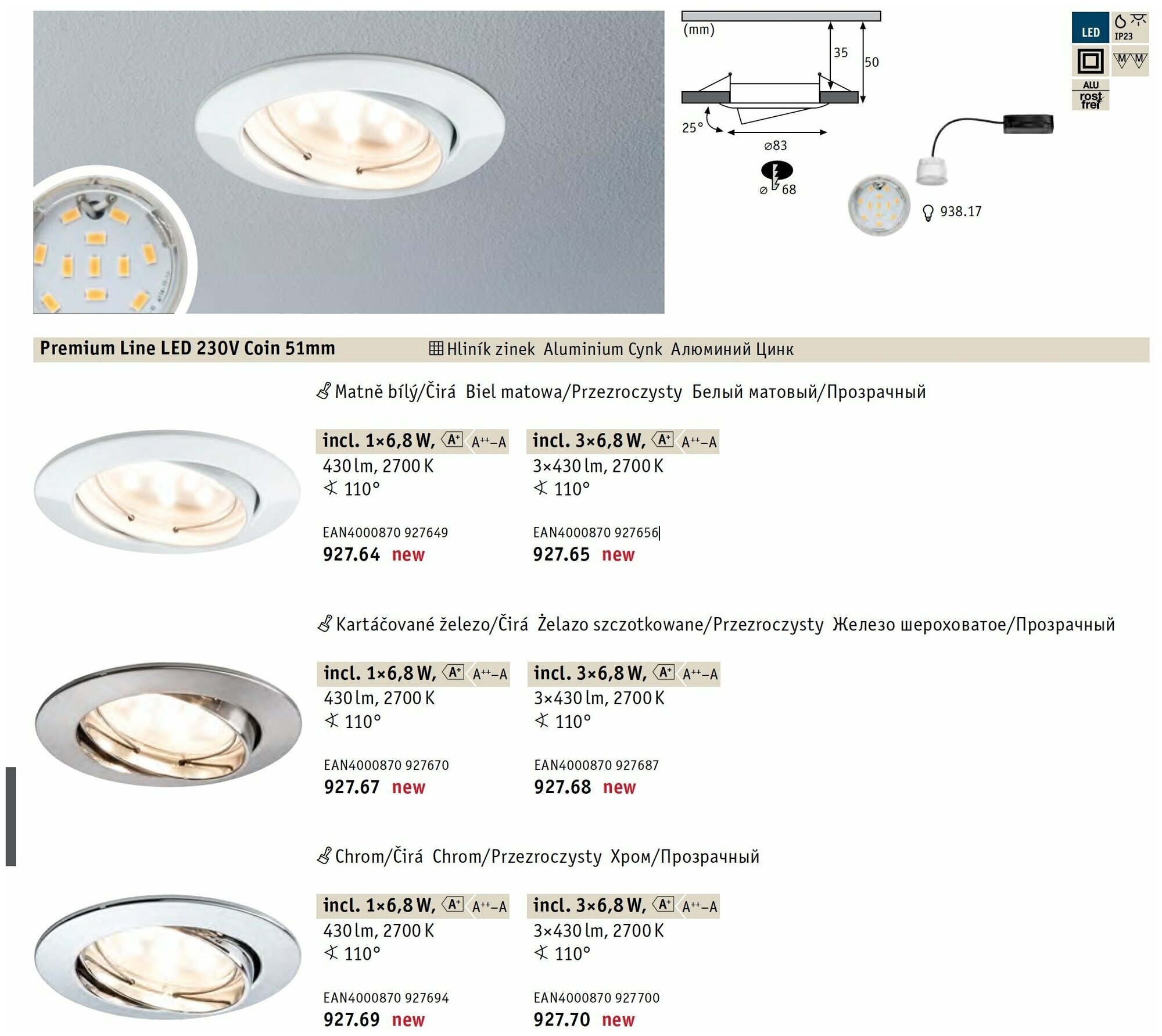 Купить Светильник встраиваемый Paulmann 6.8Вт 430Лм 2700К IP23 LED Coin 230В Хром Не димир 92769