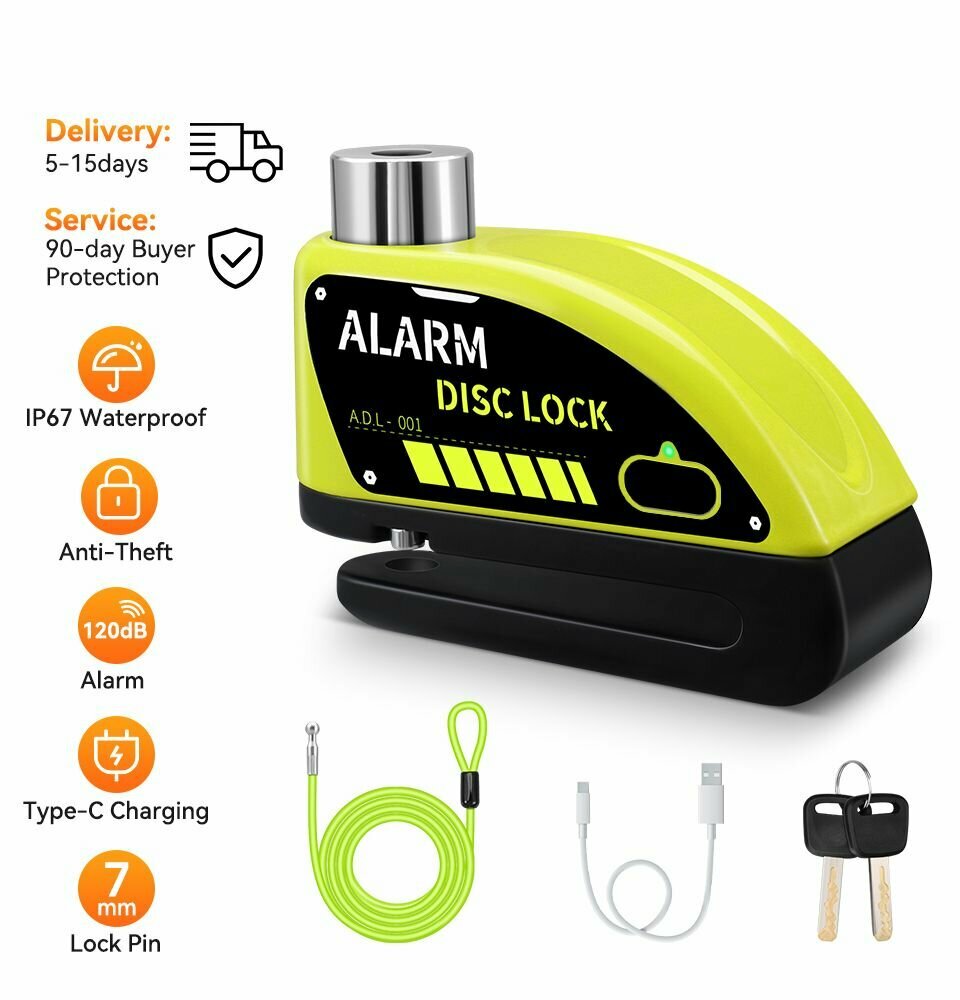 Мотоцикл дисковый тормоз замок 4D001, Противоугонный комплекс, автосигнализация,120 дБ, перезаряжаемый, жёлтый
