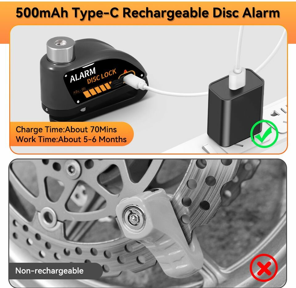 Мотоцикл дисковый тормоз замок 4D001, Противоугонный комплекс, автосигнализация,120 дБ, перезаряжаемый, чёрный