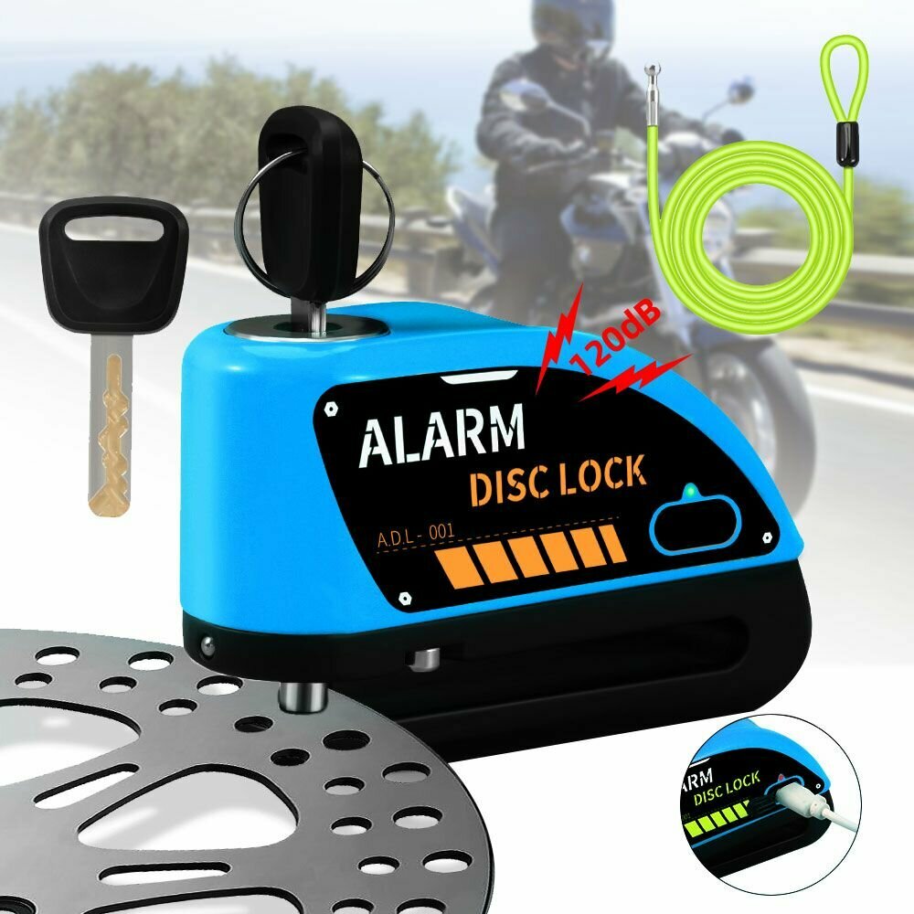 Купить Мотоцикл дисковый тормоз замок 4D001, Противоугонный комплекс, автосигнализация,120 дБ, перезаряжаемый, синий, С 1.8m противоугонный кабель