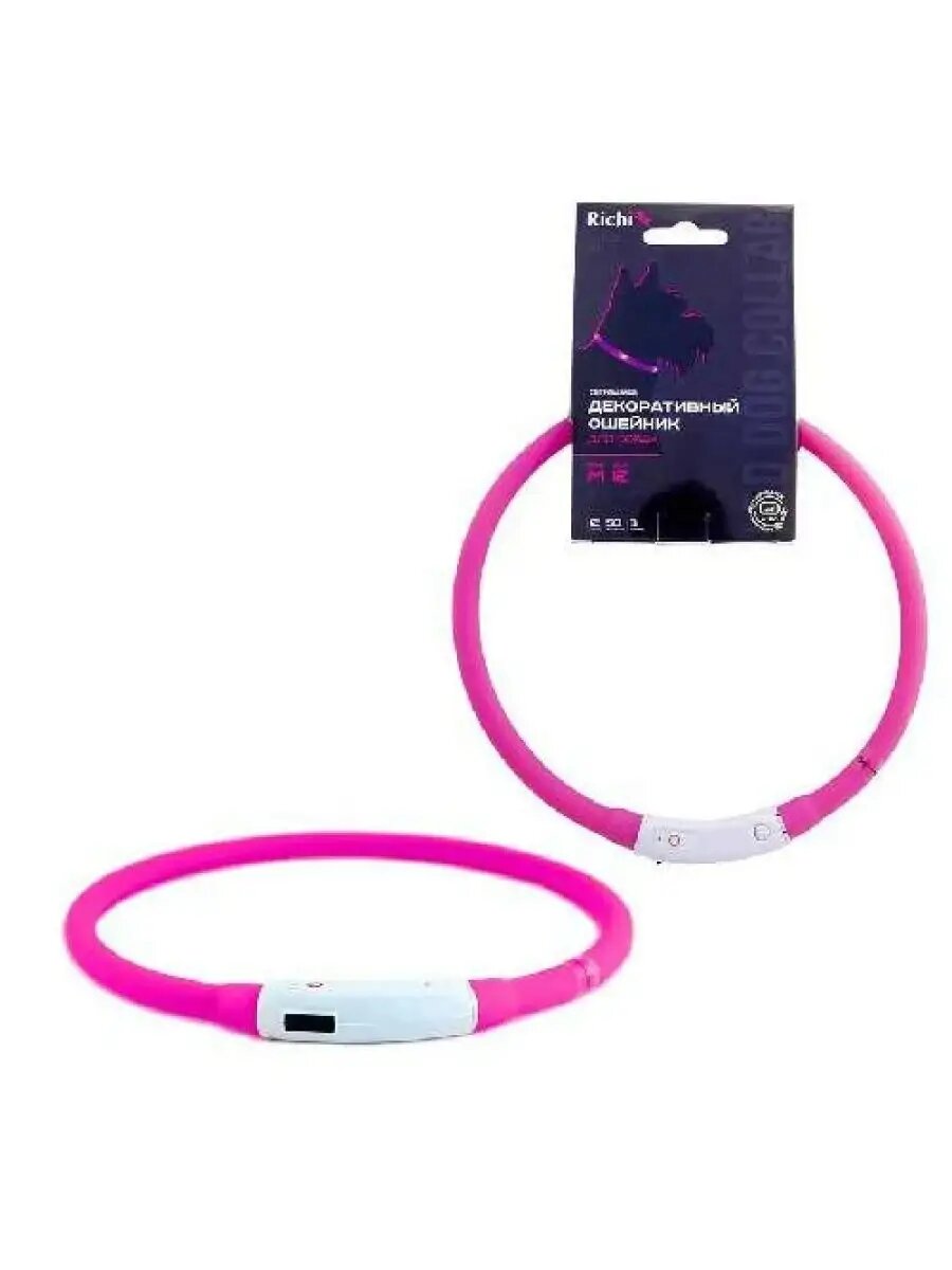 Декоративный LED ошейник RICHI 50см, розовый силиконовый, 3 режима, встроенный аккумулятор, зарядка от USB