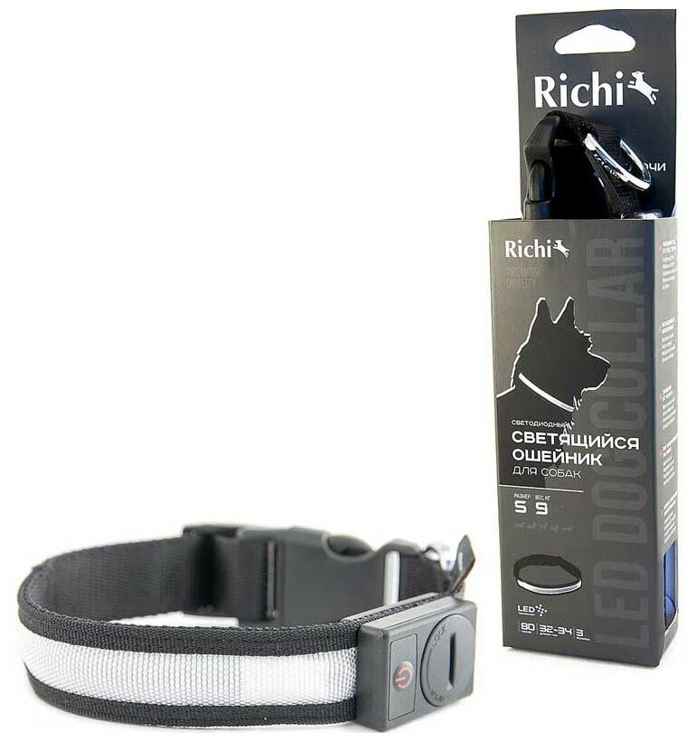 1014 Ошейник RICHI 32-34см (S) черный со светящейся лентой, 3 режима, 2xCR2025 в компл.