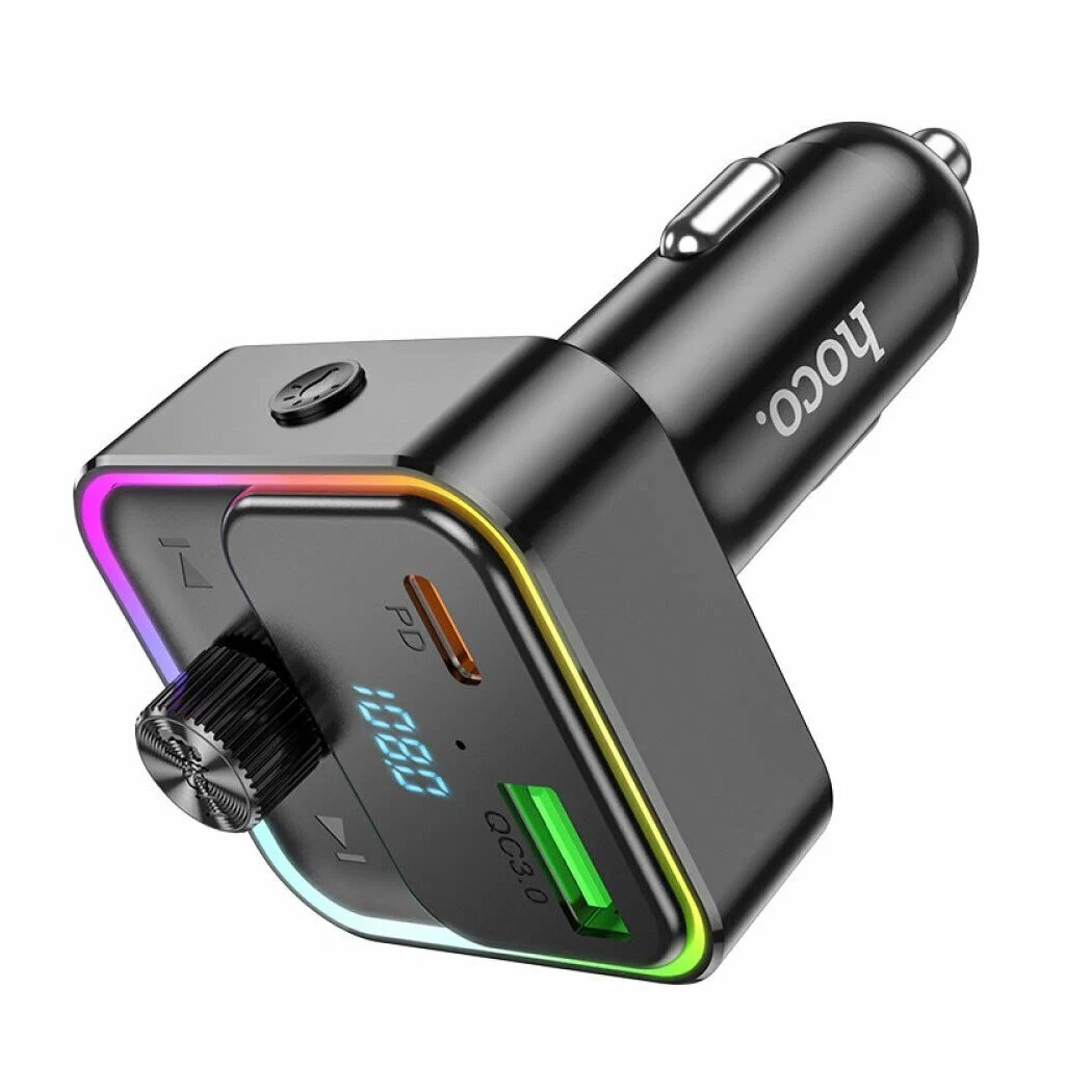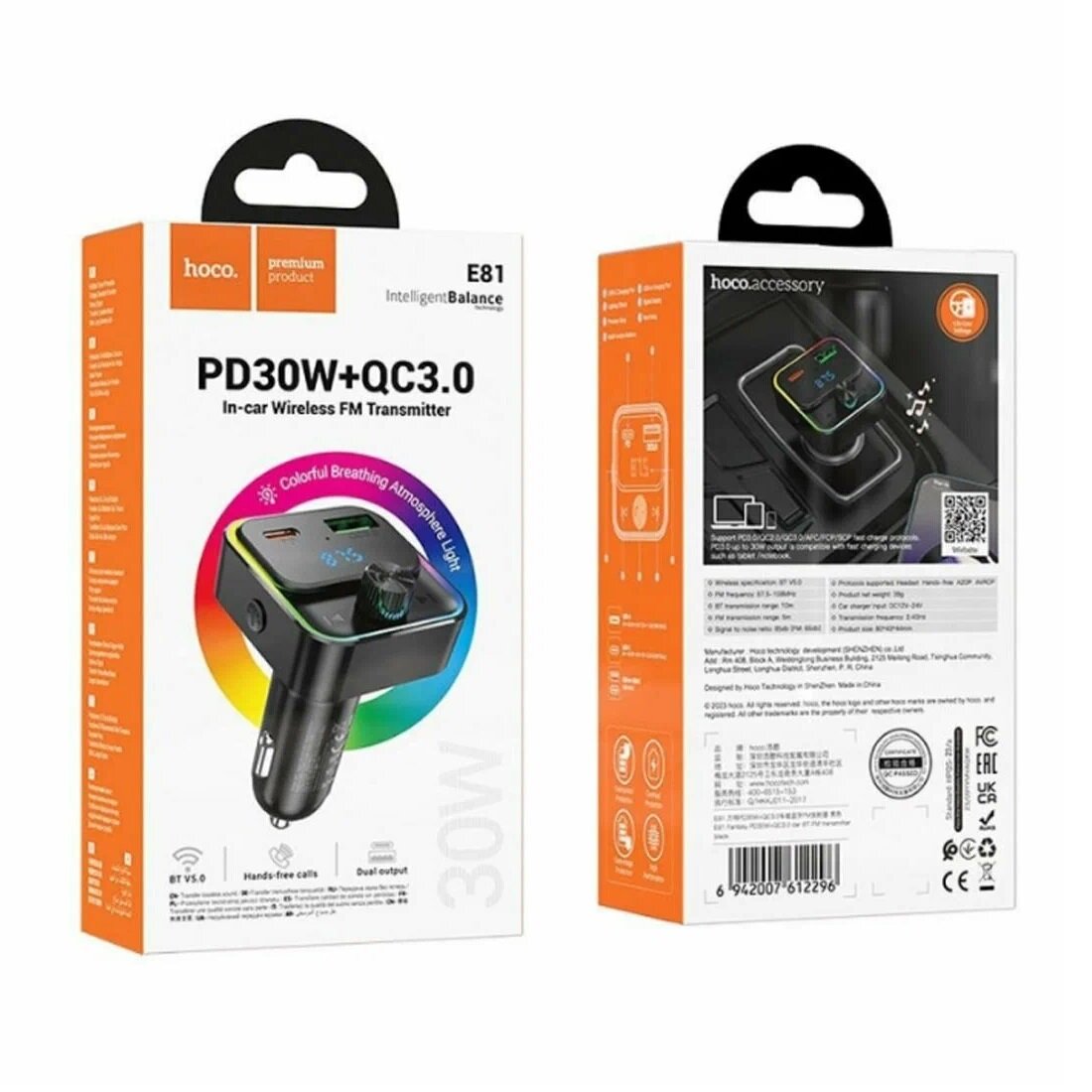Купить Автомобильный FM-трансмиттер Hoco E81 Fantasy с быстрым зарядным устройством USB+Type-C PD30W+QC3.0, BT V5.0, Hands-free calls, RGB, черный