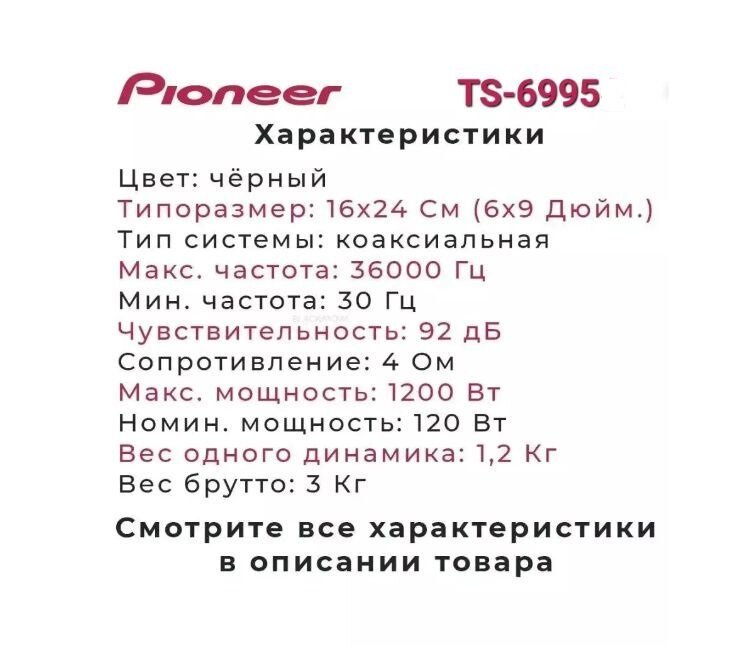 Ниже Вы можете прочитать отзывы на Динамики автомобильные коаксиальные Pioneer ОК 1200W, 4 Ом, 1200Вт, 5-полосная, 16x9см, ознакомится с подробными характеристиками, посмотреть интересные обзоры и фотографии на Динамики автомобильные коаксиальные Pioneer ОК 1200W, 4 Ом, 1200Вт, 5-полосная, 16x9см.
