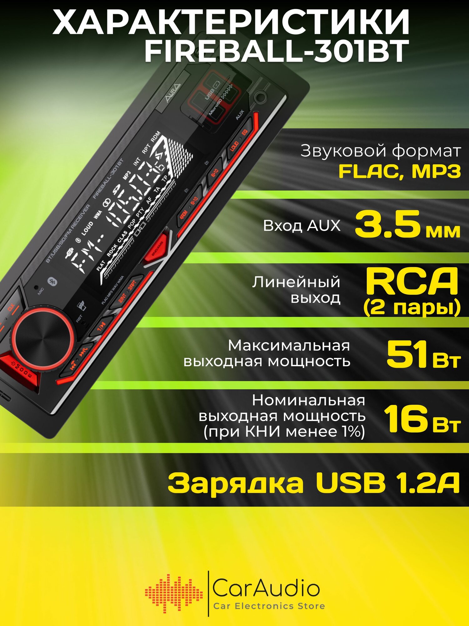 Магнитола автомобильная Aura FIREBALL-101BT USB/SD/MMC-ресивер, зелёная подсветка