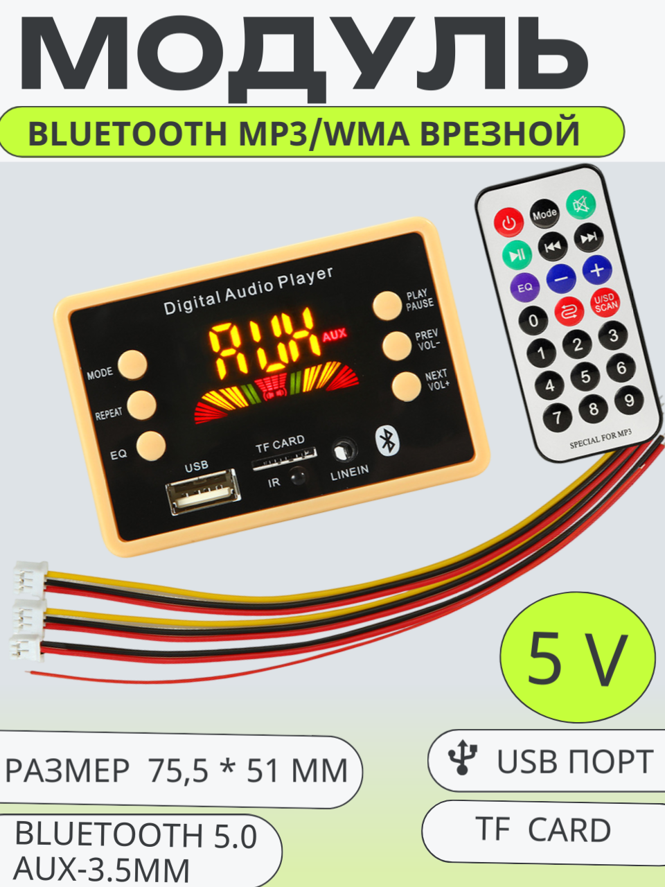Стерео аудио модуль врезной c пультом + шлейфы 5V, MP3/WMA , Bluetooth 5.0, AUX-3.5мм USB/TF до 32ГБ, Чип: AC6905 интересное: