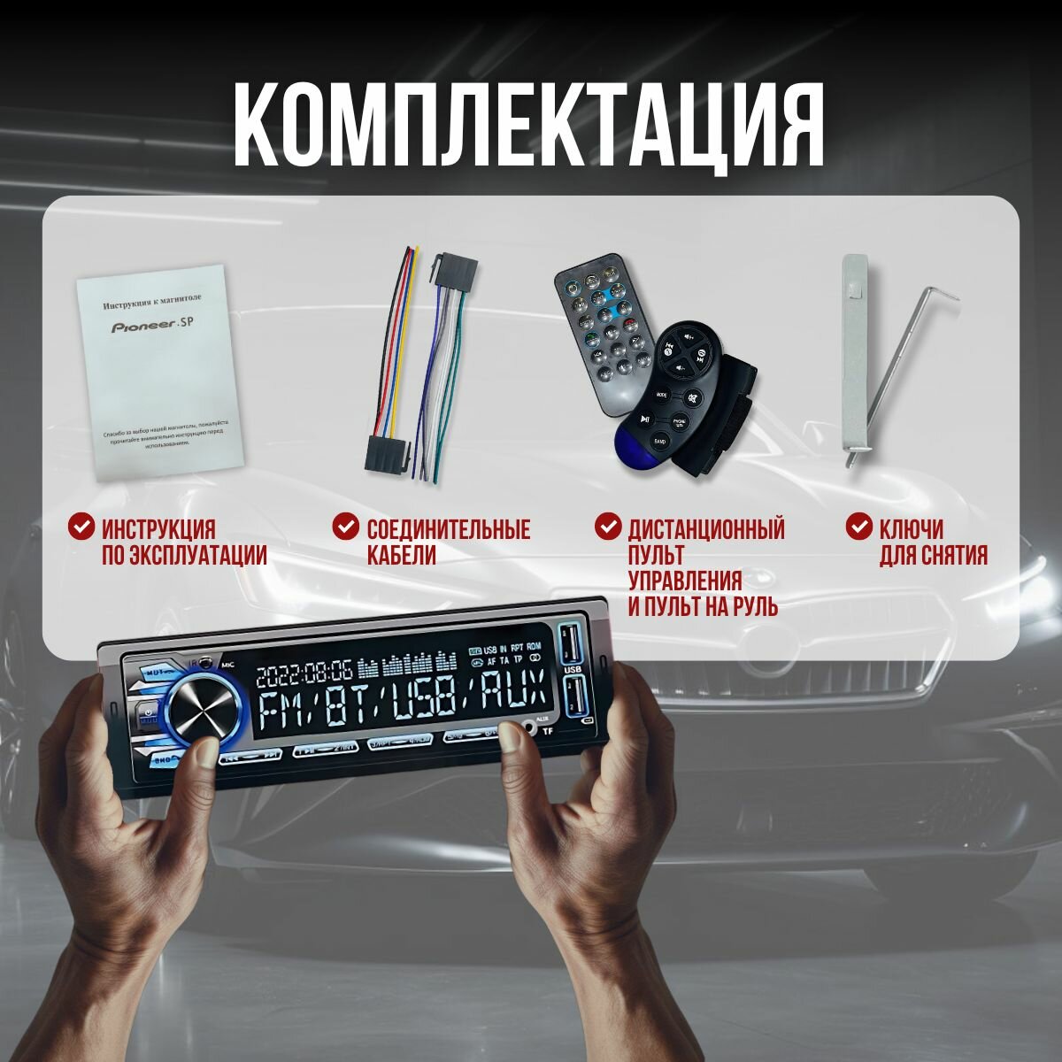 | Подробная комплектация | Магнитола 1 din, фишки, крепления, дистанционный пульт, пульт управления на руль, инструкция |