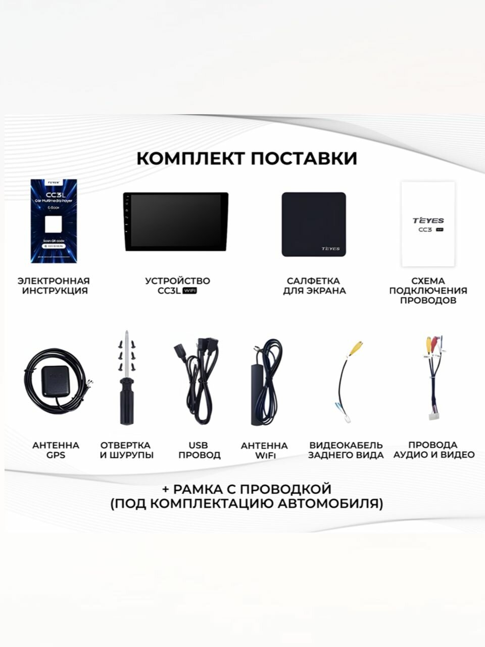 | Подробная комплектация | Планшет, Рамка, Электронная инструкция, Схема подключения проводов, GPS антенна, 4G антенна, Салфетка, Отвертка и шурупы, Провода аудио и видео, USB провод, RCA. |