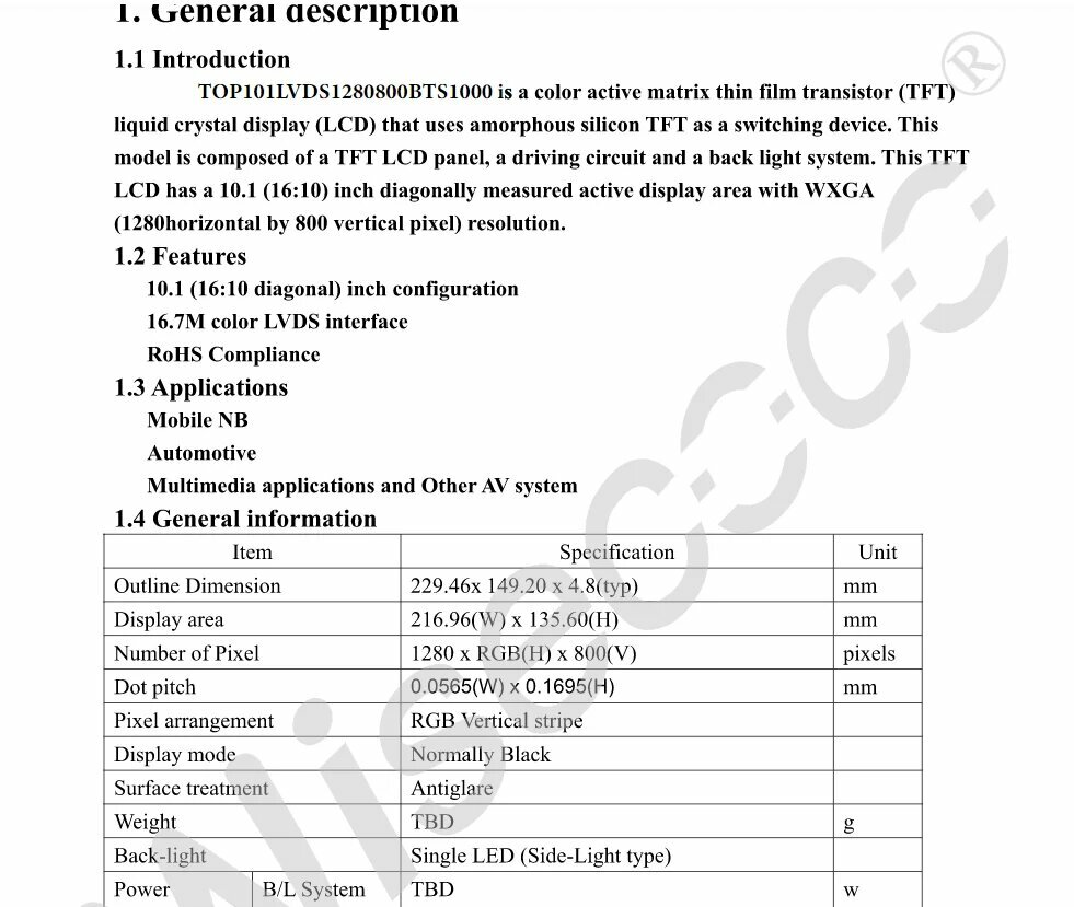 | Номер модели | TOP101LVDS1280800BTS1000 |