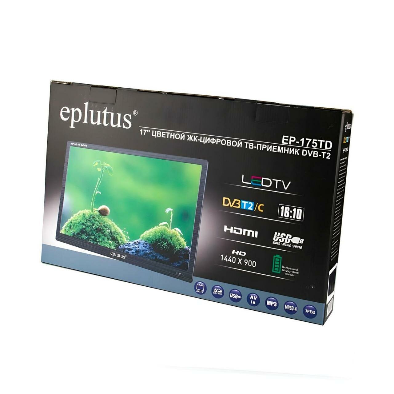 Купить Портативный телевизор 1440x900, телевизор Eplutus 175=TD (17”) 17 HD, черный. Телевизор с цифровым тюнером и аккумулятором 4000 мАч.