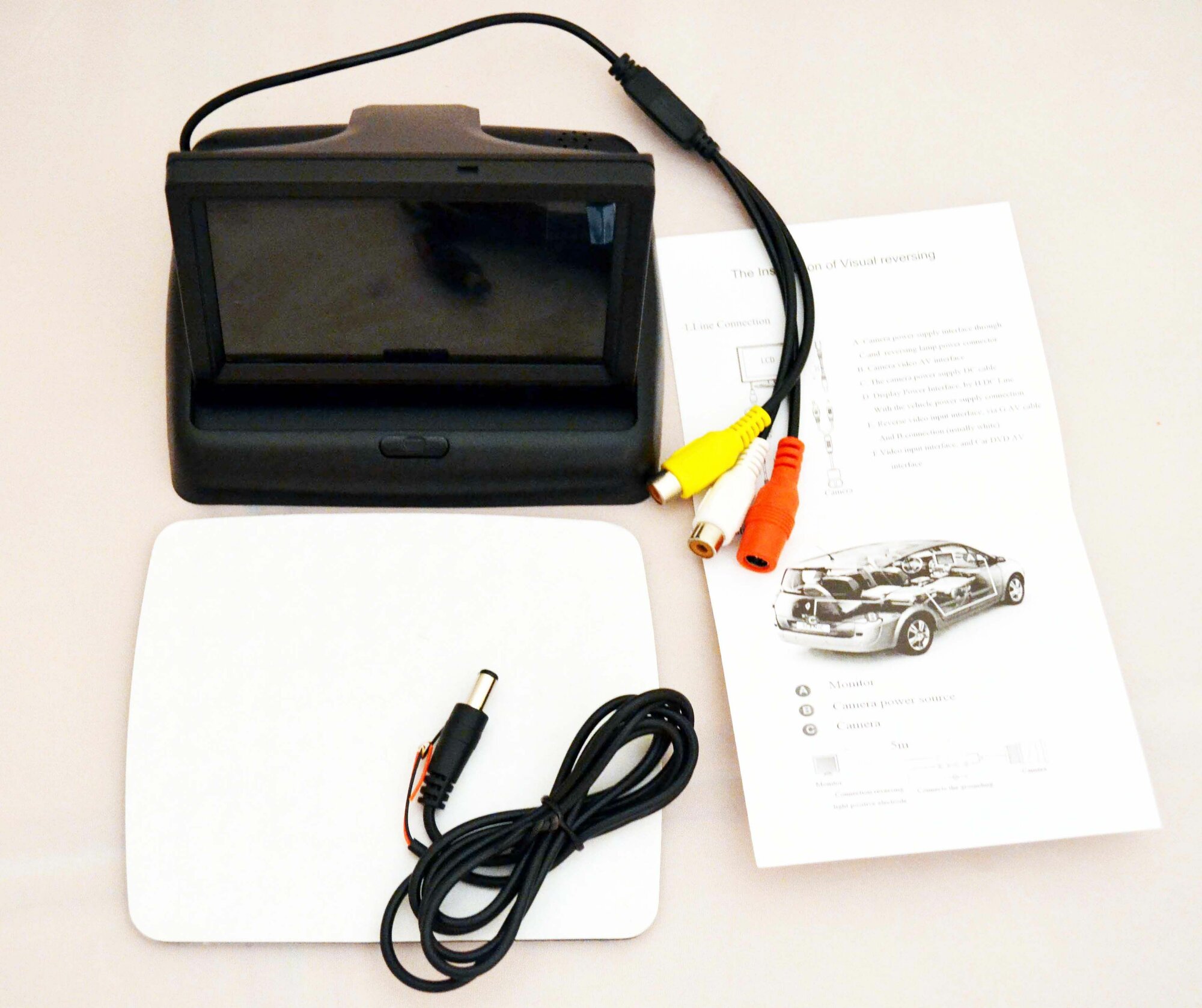 | Подробная комплектация | 1. Монитор. 2. Кабель питания на 12V. 3. Двухсторонняя липучка для крепления. 4.Инструкция. |