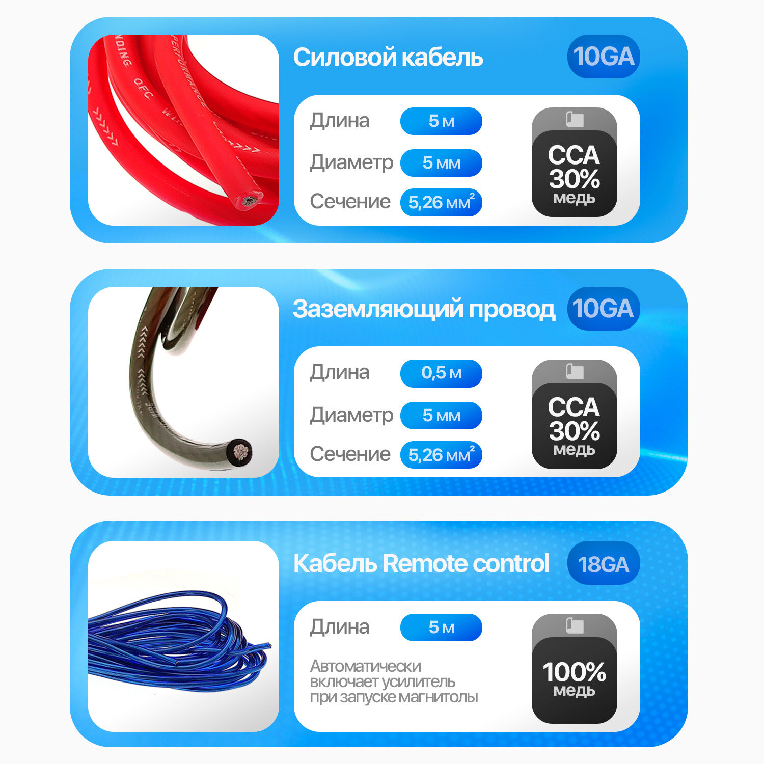 | Комплектация | Питание (красный) - 4.5м; (диаметр 3,26мм / сечение 8.35 кв.мм.) - омеднённый алюминий (CCA 30% медь) Чёрный "заземление" - 0,5м; (диаметр 3,26мм / сечение 8.35 кв.мм.) - омеднённый алюминий (CCA 30% медь) Синий Remote cantrol - 4.5м (23*0.12) Колба с предохранителем ATC 60 А Концевики RCA-кабель тройной экран - 4.5м |