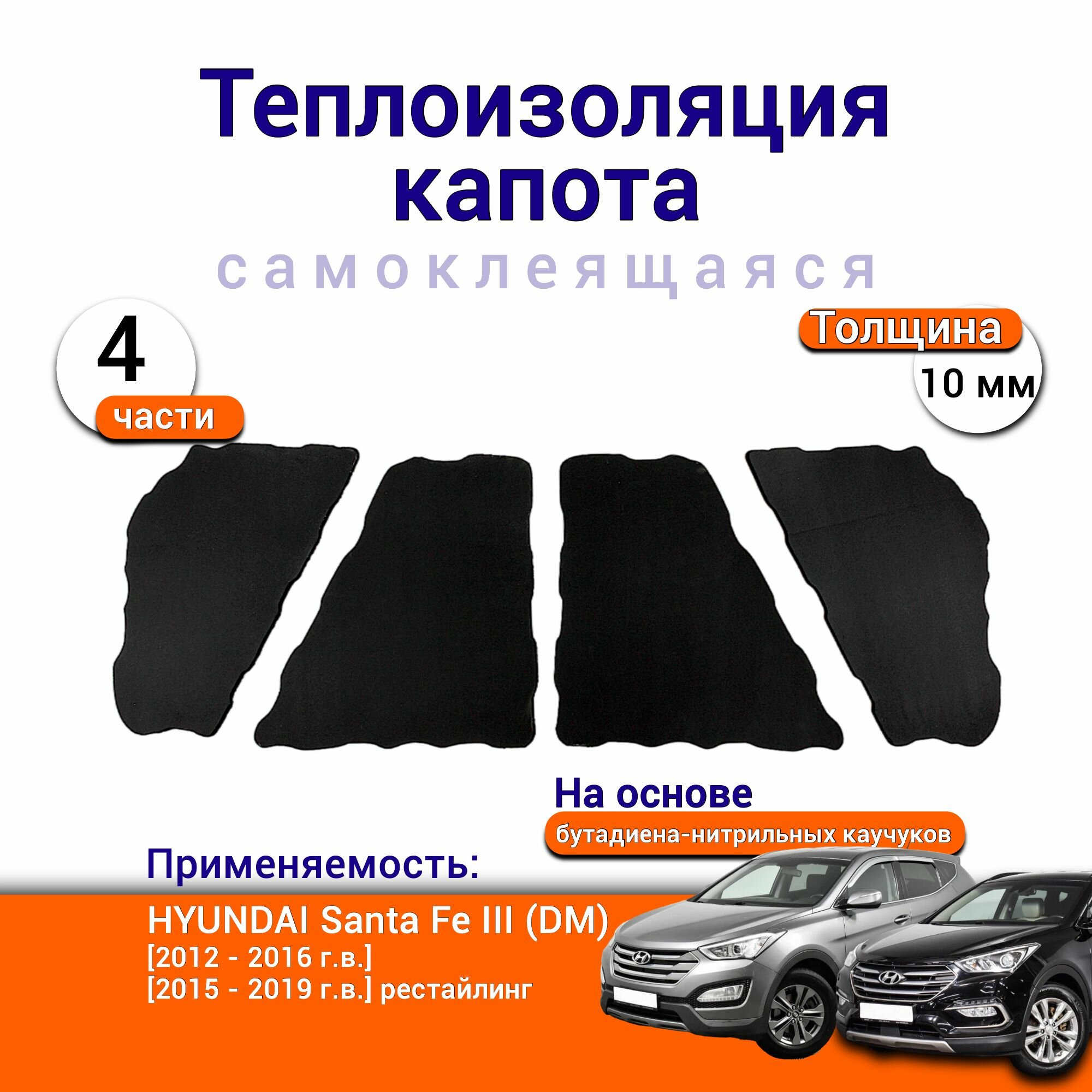 Купить Теплоизоляция капота Hyundai Santa Fe III DM 2012-2019 самоклеящаяся на основе вспененного каучука комплект из 4 частей