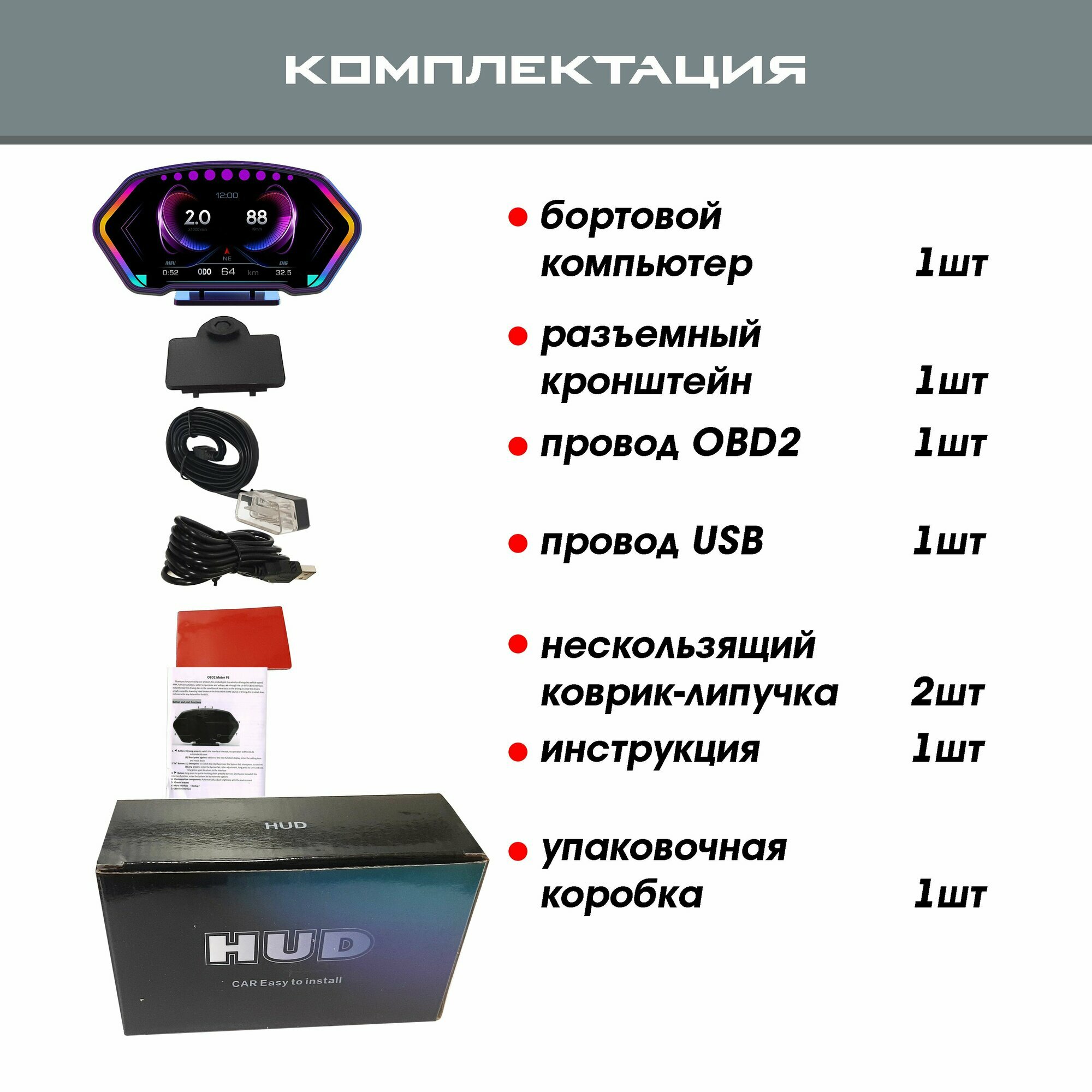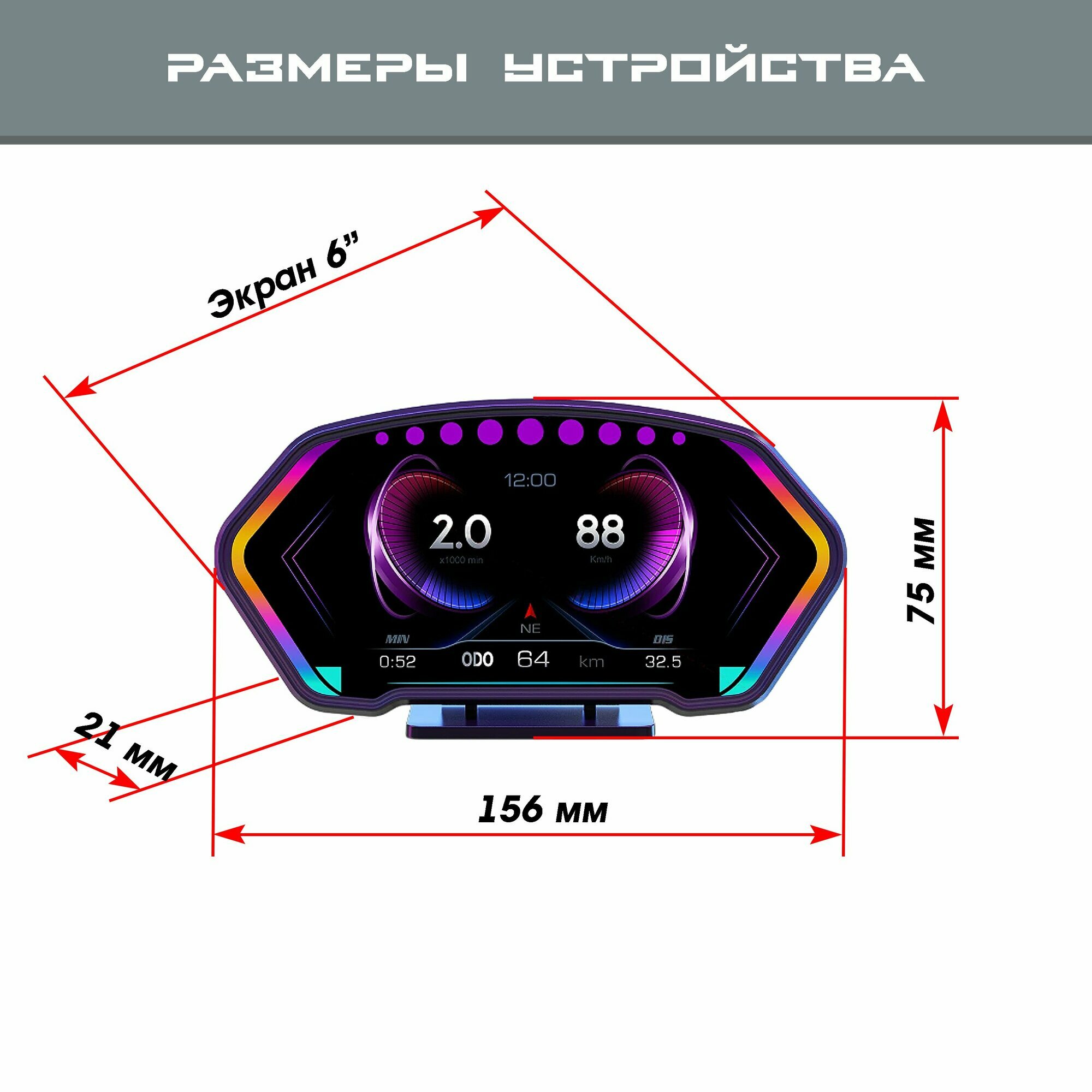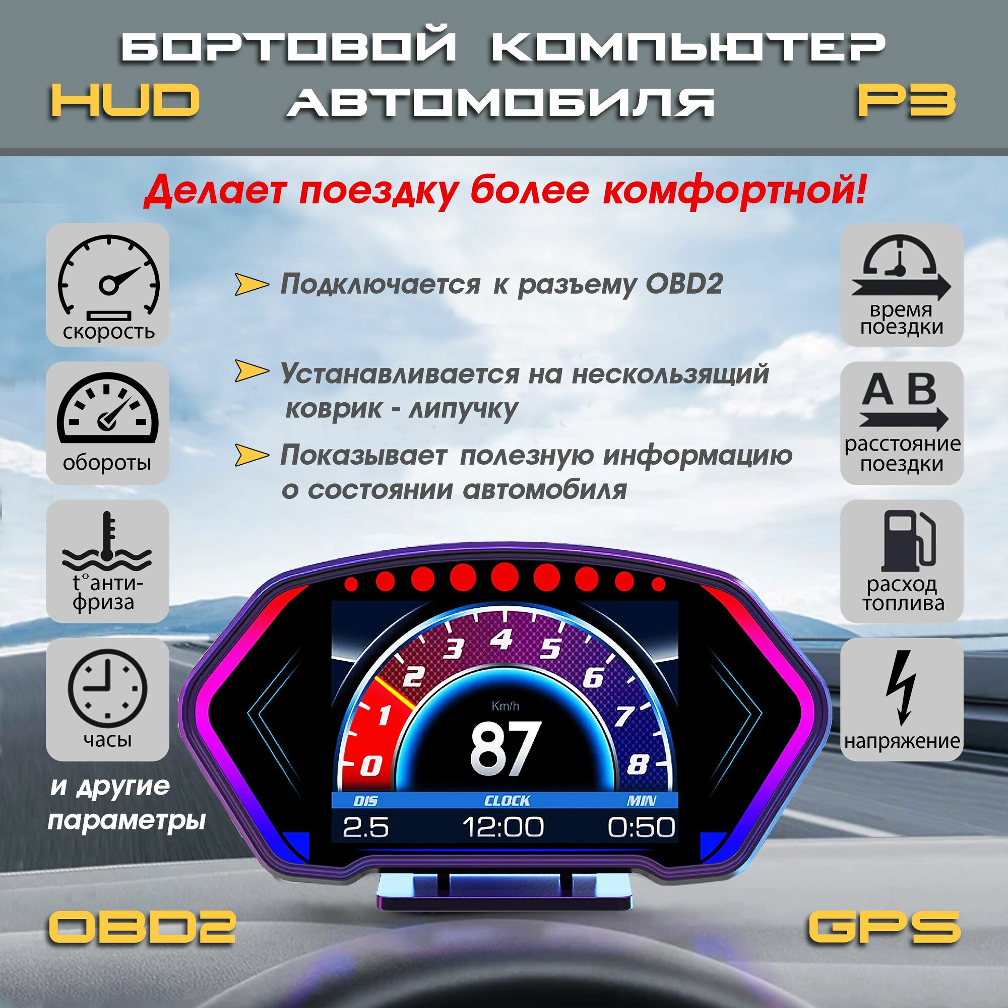 Бортовой компьютер GP PRO-TECH, подключение через OBD2, спидометр, тахометр, температура ОЖ, расход топлива