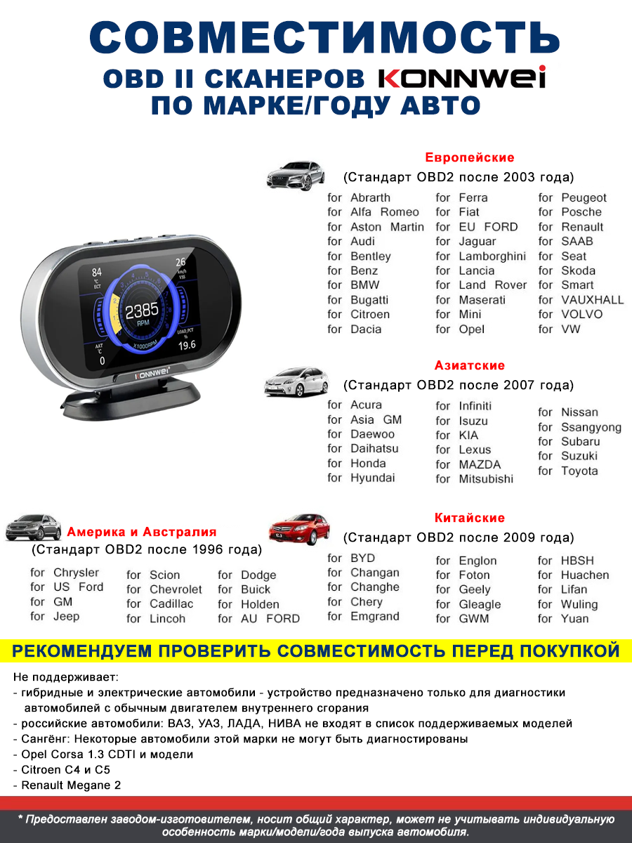 Бортовой компьютер / Диагностический сканер Konnwei KW206 (цветной экран, на приборную панель) интересное: