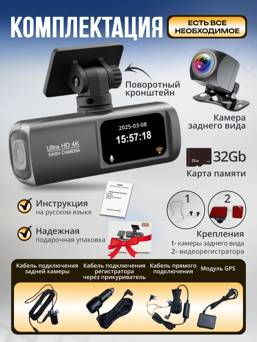 Видеорегистратор для автомобиля 4K с Wi-fi, GPS, ACC, картой памятью и камерой заднего вида Full HD интересное: