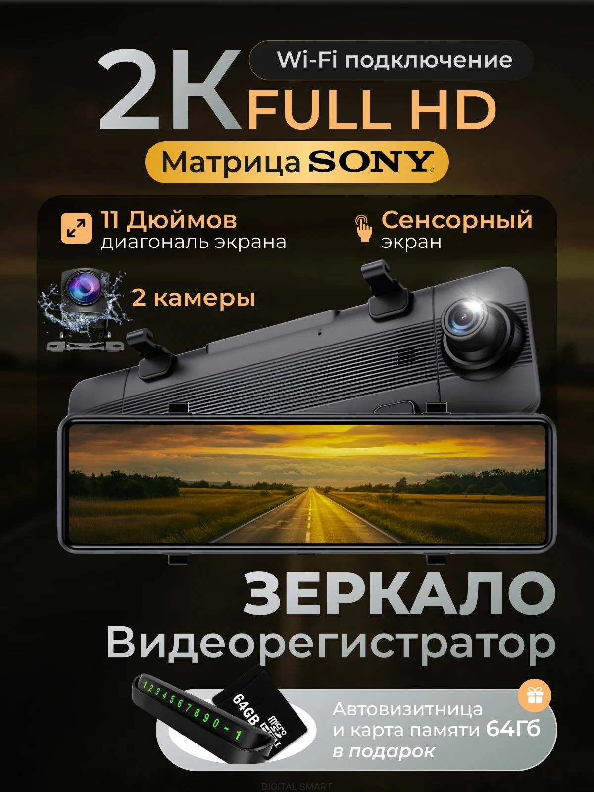 Купить Видеорегистратор зеркало с камерой заднего вида 2К WiFi 11-дюймовый с подарком