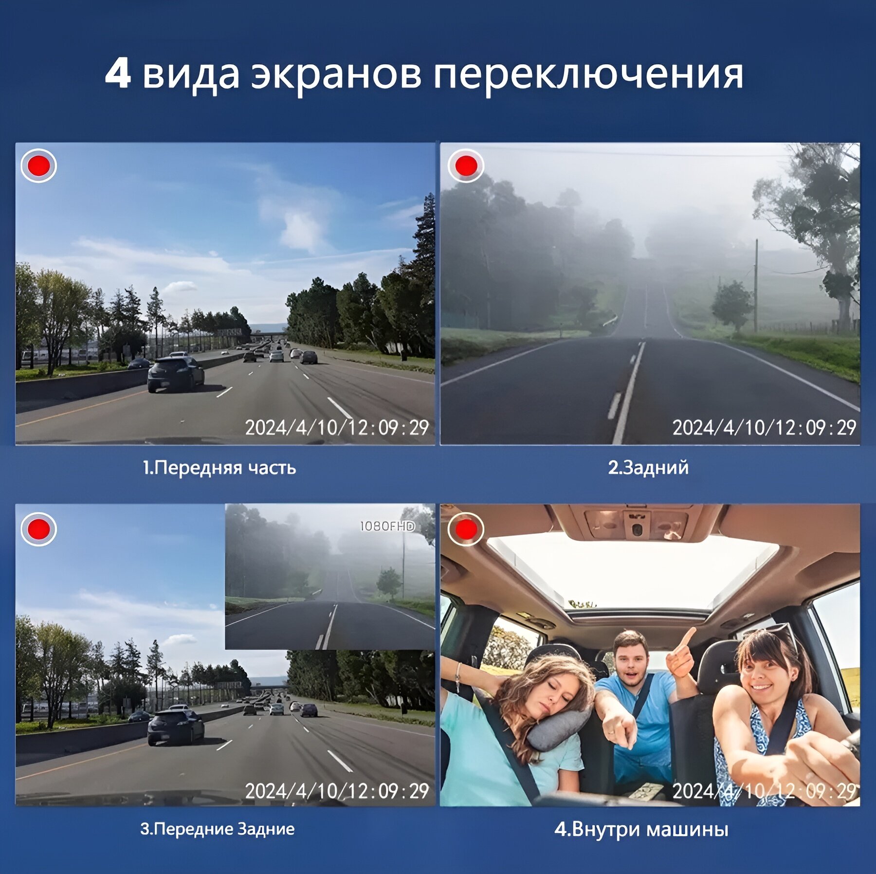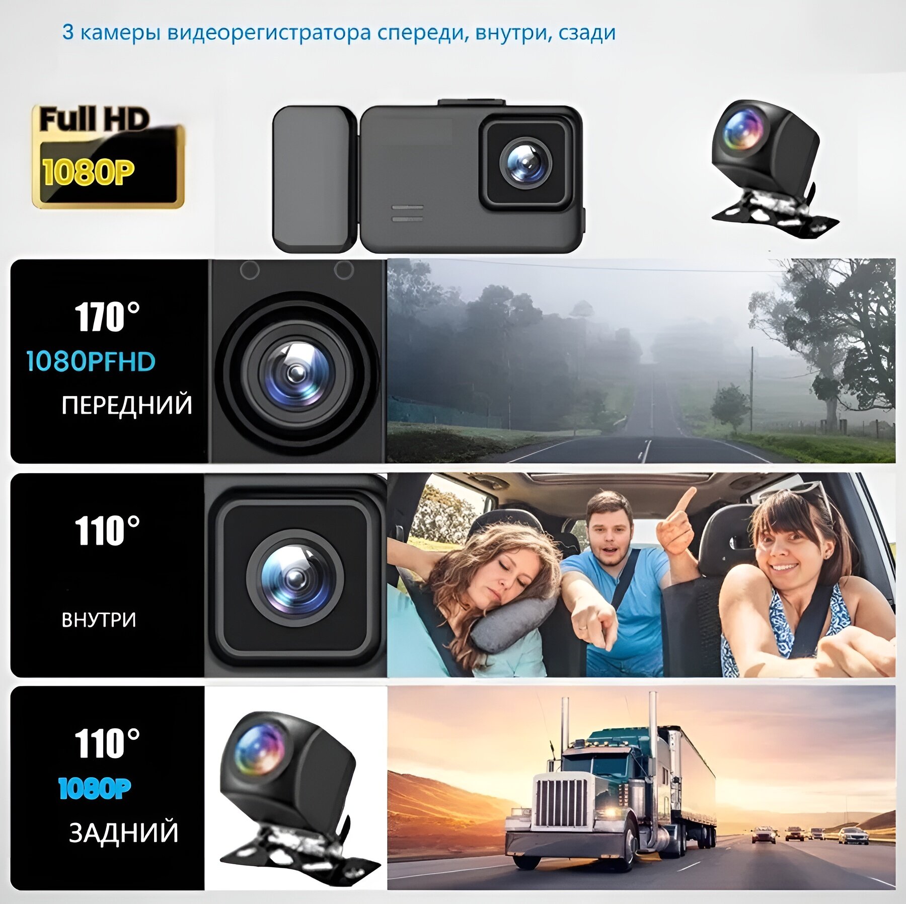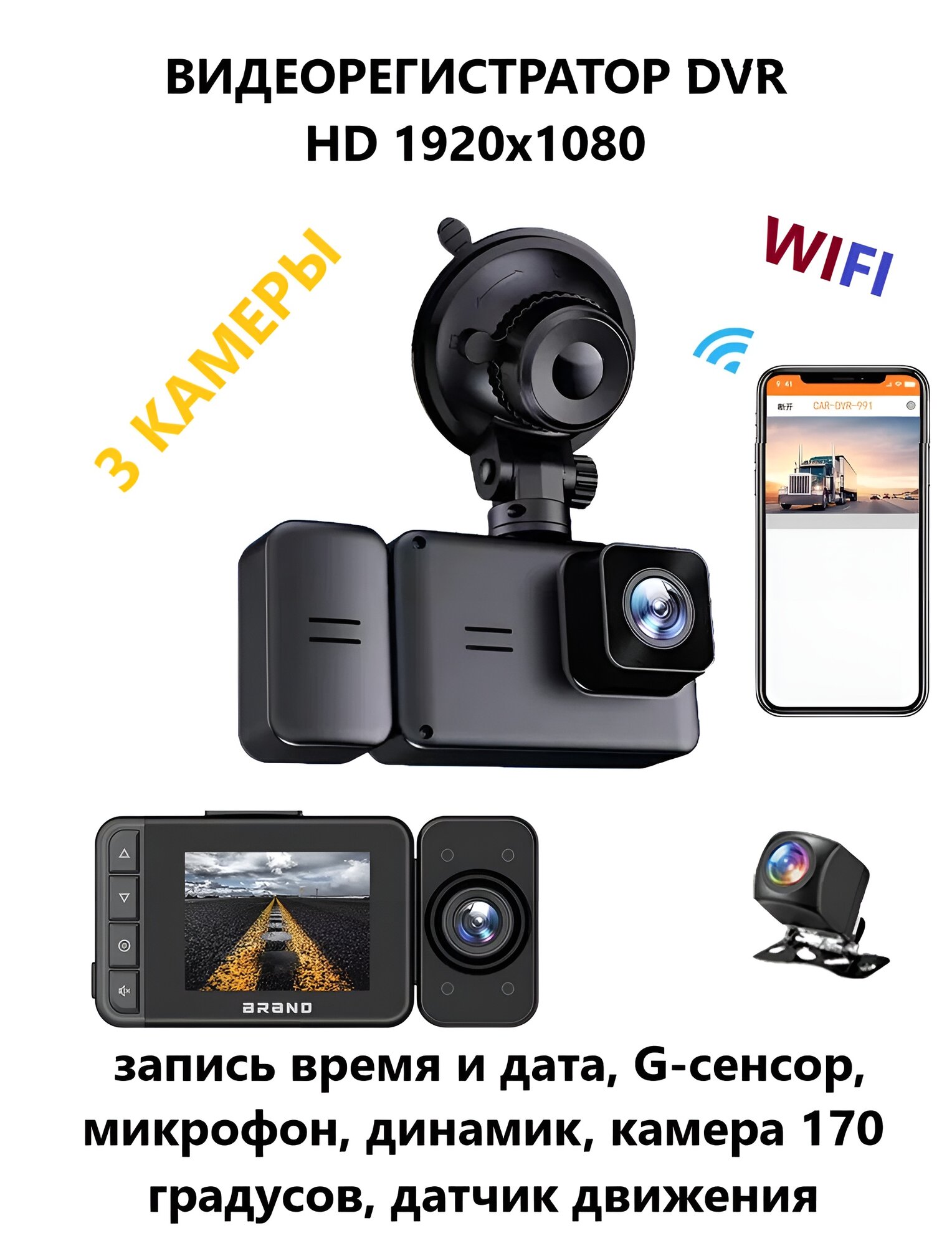 Видеорегистратор WI-FI 3 Камеры 3 дюйма Разрешение HD 1920х1080 G-сенсор Запись звука, времени, даты DVR интересное: