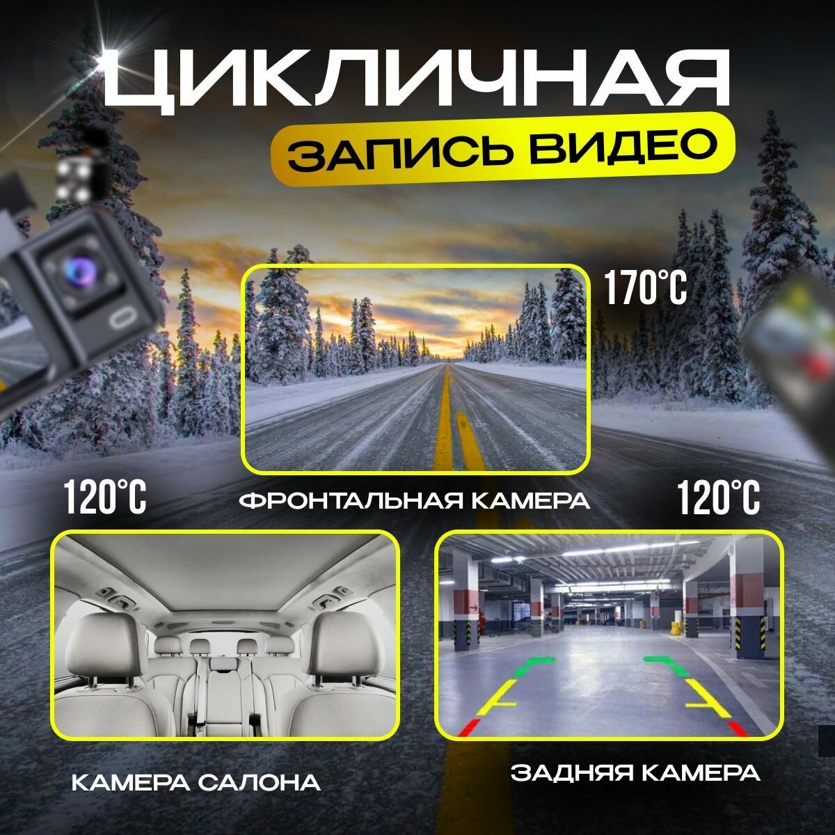 | Конструктивные особенности | Встроенный динамик, Запись времени и даты, Запись звука, Запись по детектору движения, Камера заднего вида, салона, Поворотная камера |