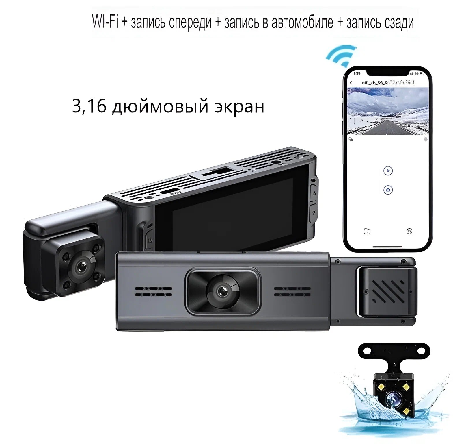 Видеорегистратор WI-FI 3 Камеры 3,16 дюймов Разрешение HD 1920х1080 G-сенсор Запись звука, времени, даты CAR DVR S18 интересное: