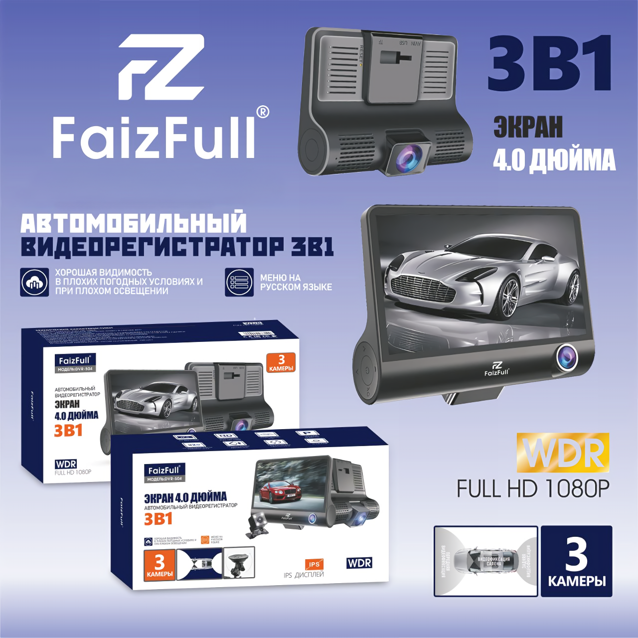 Автомобильный видеорегистратор, Full HD, G-сенсор, WDR, камера заднего вида, 3 камеры интересное: