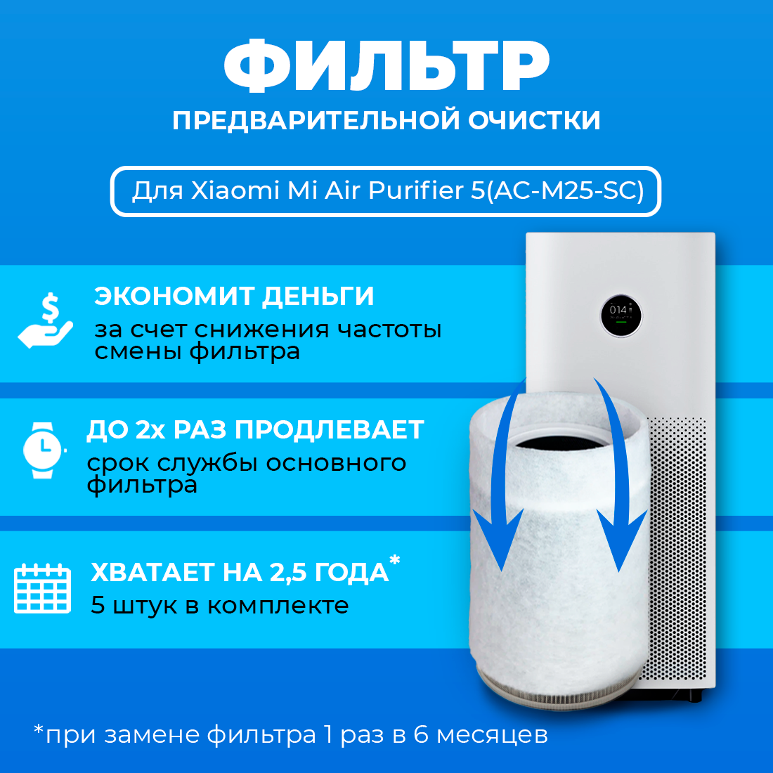 Фильтр для очистителя воздуха Xiaomi Mi Air Purifier 5 (AC-M25-SC). Префильтр. 5 шт. интересное: