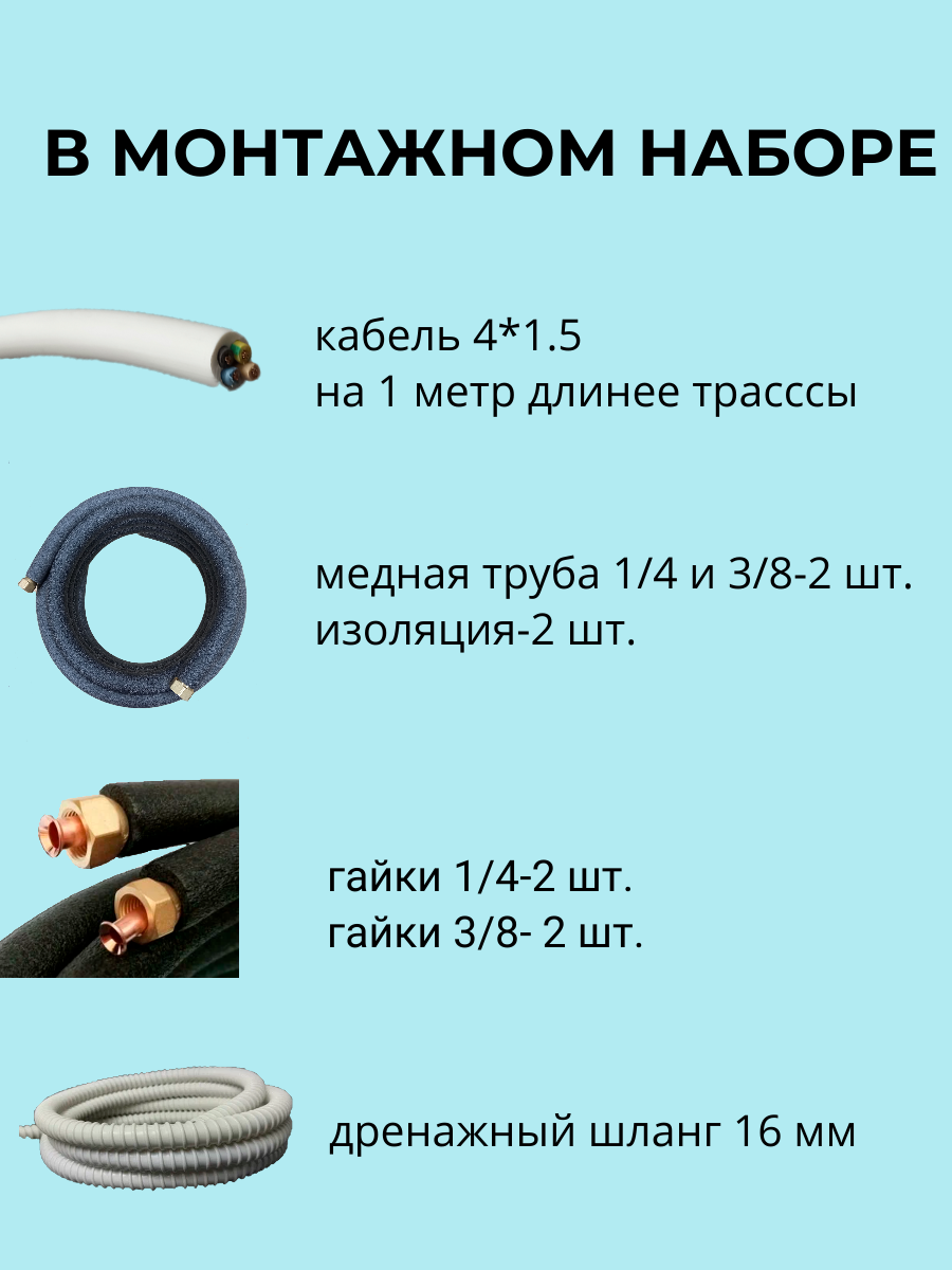 | Подробная комплектация | медная трубка 1/4с вальцовкой; медная трубка 3/8 с вальцовкой; изоляция трубная 06; изоляция трубная 10; дренажный шланг 16мм; ПВС 4х1.5 |