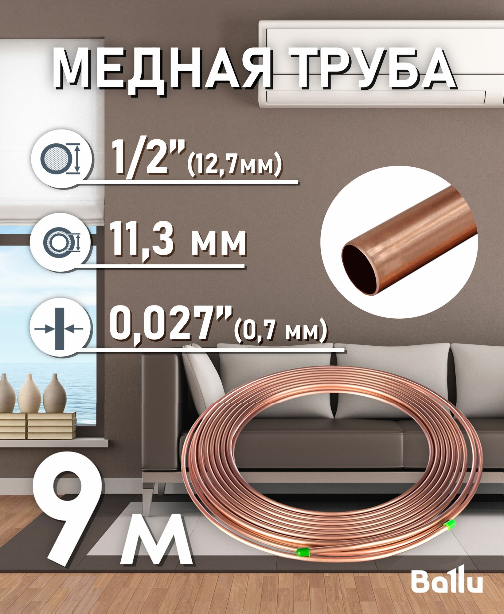 Труба медная 1/2" (12,7 мм) 8 метров Ballu Olympic