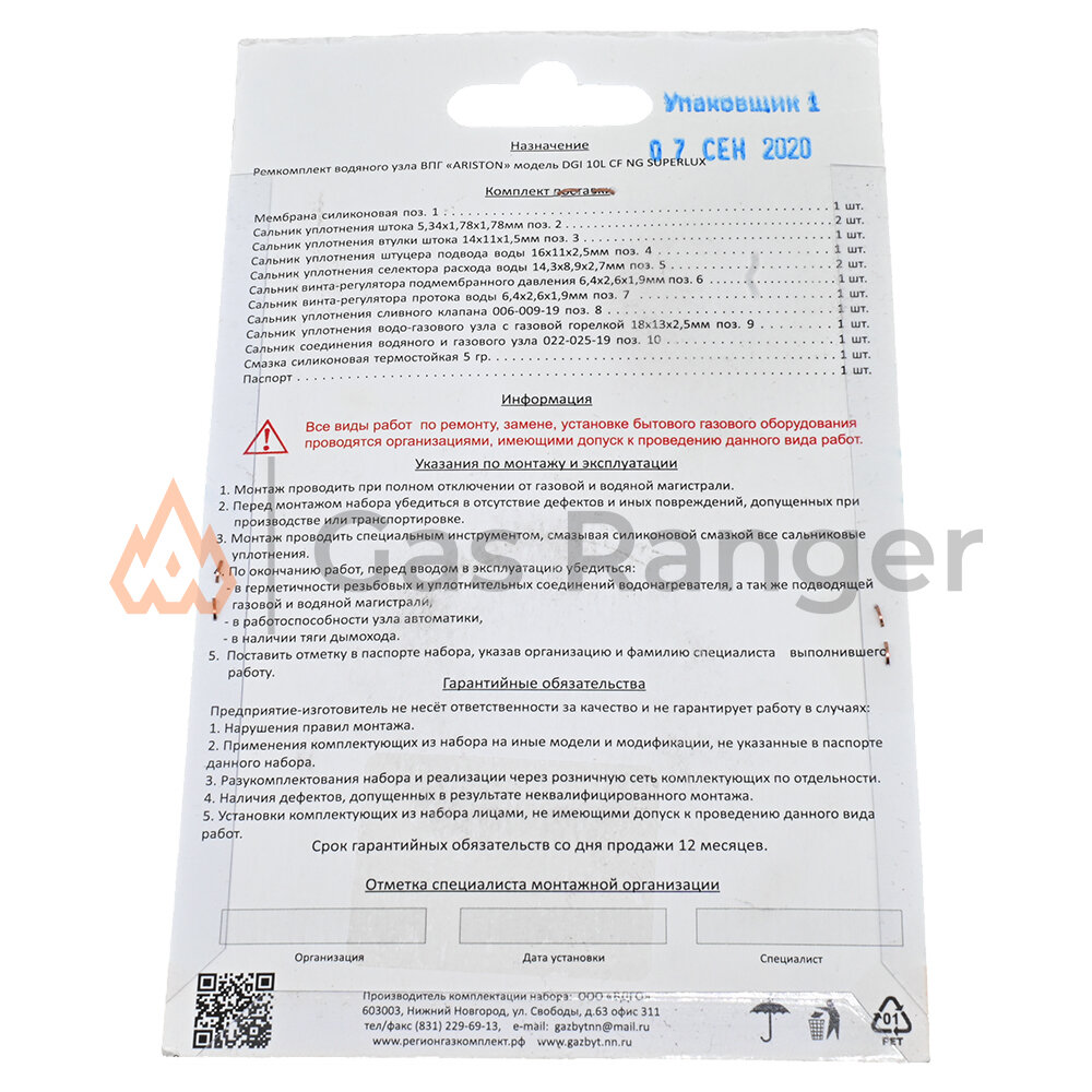 | Подробная комплектация | Мембрана силиконовая, 1 шт. Сальник уплотнения штока (5,34 х 1,78 х 1,78 мм), 2 шт. Сальник уплотнения втулки штока (14 х 11 х 1,5 мм), 1 шт. Сальник уплотнения штуцера подвода воды (16 х 11 х 2,5 мм), 1 шт. Сальник уплотнения селектора расхода воды (14,3 х 8,9 х 2,7 мм), 2 шт. Сальник винта-регулятора подмембранного давления (6,4 х 2,6 х 1,9 мм), 1 шт. Сальник винта-регулятора протока воды (6,4 х 2,6 х 1,9 мм), 1 шт. Сальник уплотнения сливного клапана 006-009-19, 1 шт. Сальник уплотнения водо-газового узла с газовой горелкой (18 х 13 х 2,5 мм), 1 шт. Сальник соединения водяного и газового узла 022-025-19, 1 шт. Смазка силиконовая термостойкая, 5 гр., 1 шт. Паспорт |