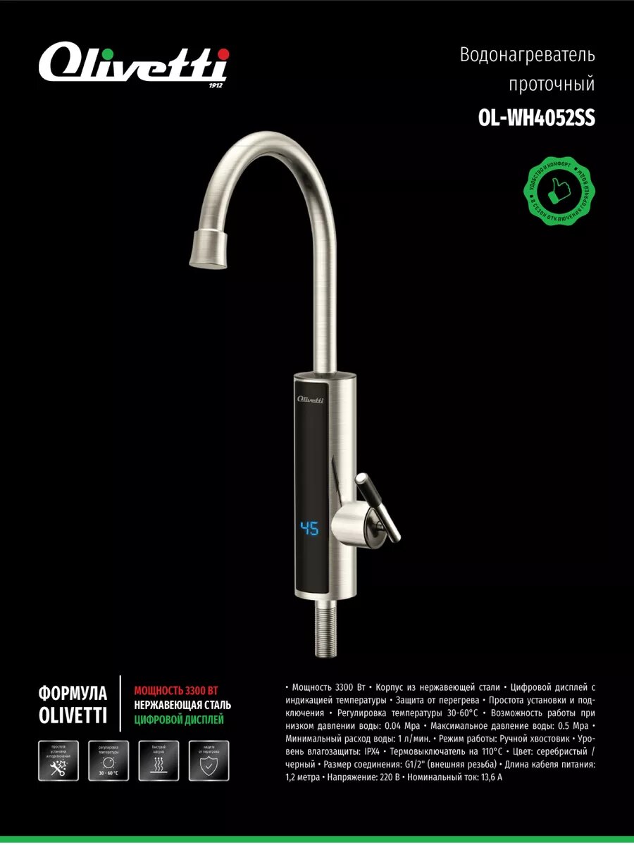 Водонагреватель проточный с краном OLIVETTI OL-WH4053SS интересное: