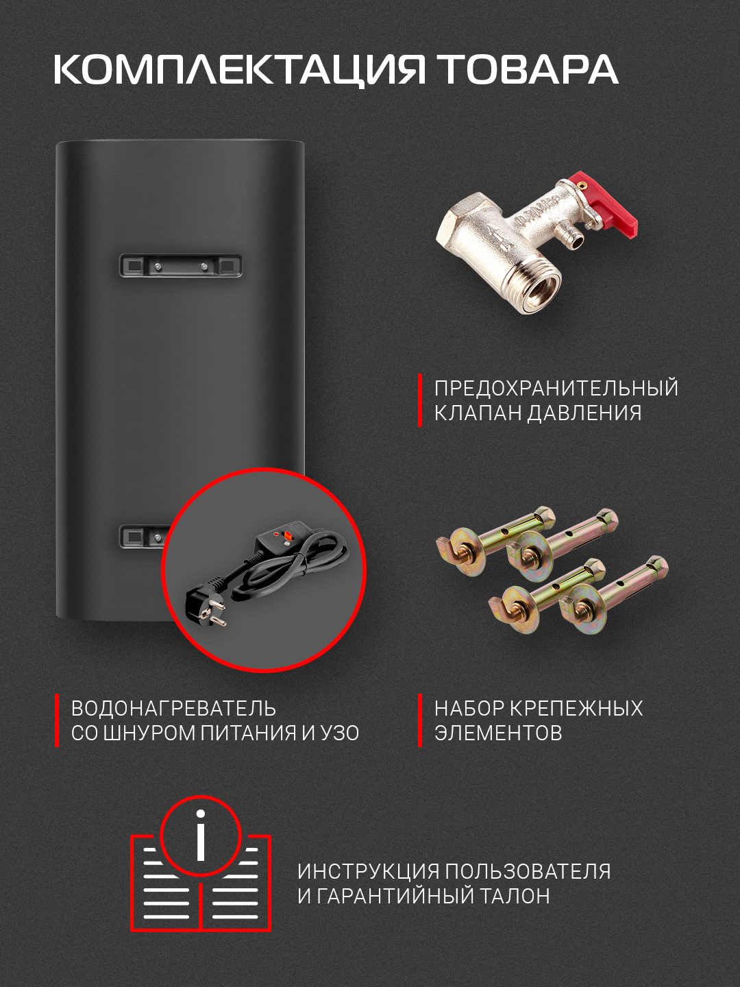 | Комплектация | Водонагреватель; Инструкция по эксплуатации; Гарантийный талон; Набор крепежных элементов; Обратно-предохранительный клапан. |