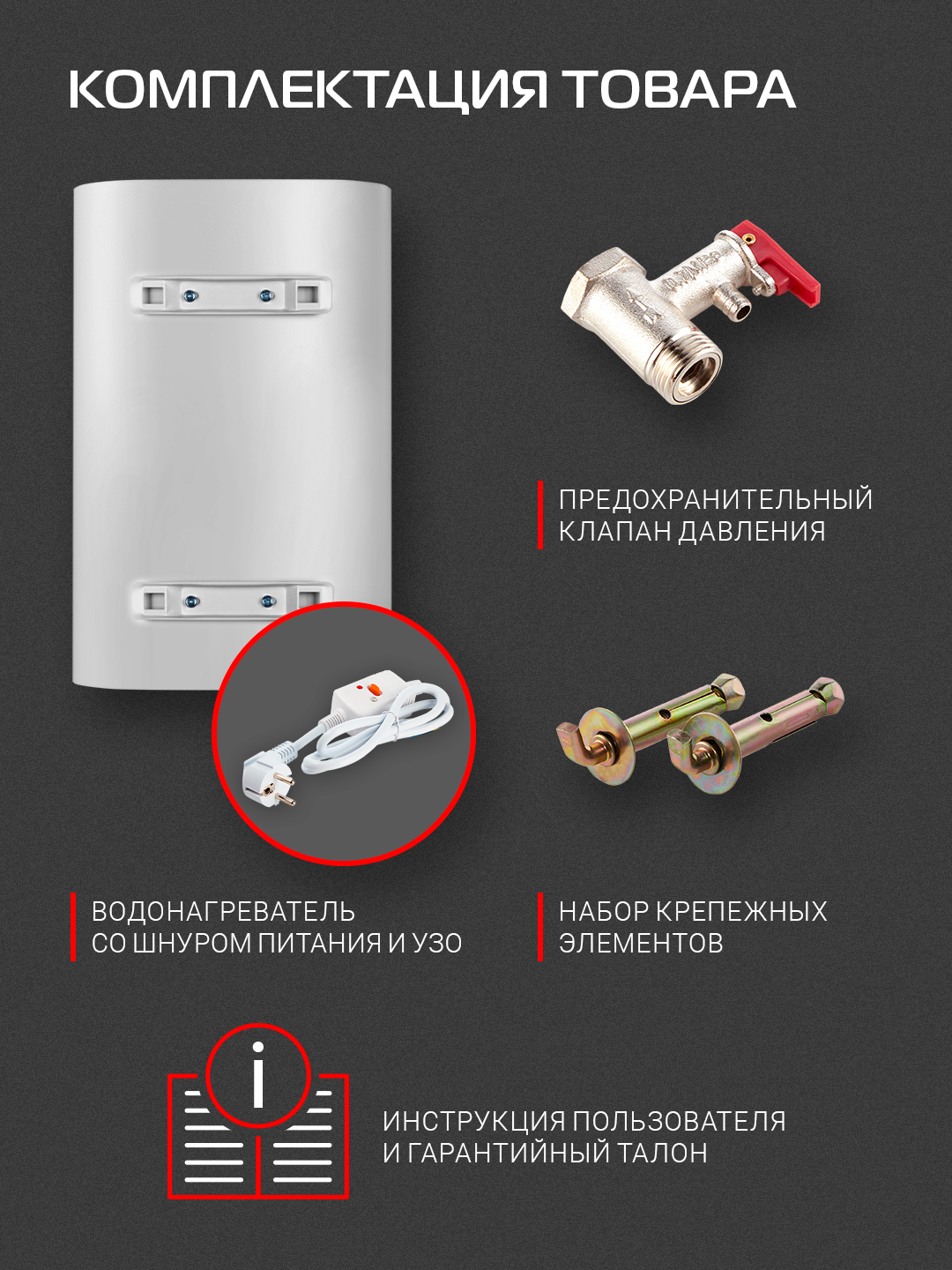 | Комплектация | Водонагреватель; Инструкция по эксплуатации; Гарантийный талон; Набор крепежных элементов; Обратно-предохранительный клапан. |