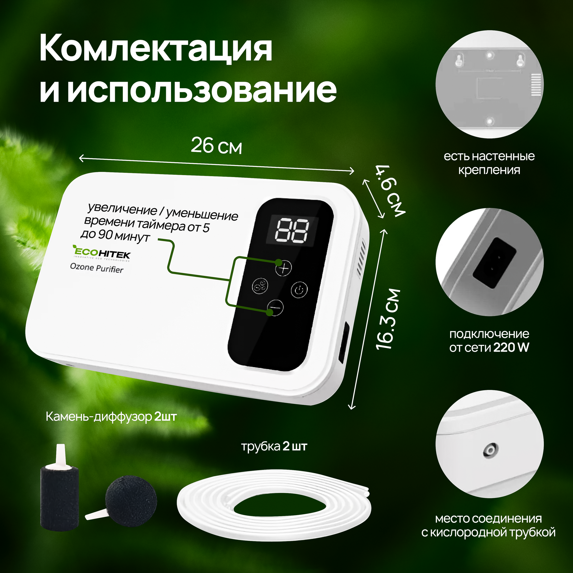 Озонатор 500 мг/час, 220AC/12DC с таймером. Очиститель и очиститель воздуха, воды, продуктов и холодильника, охват до 50 м2. Озонатор для дома.